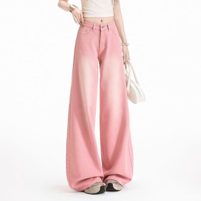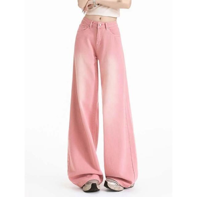 限時下殺 牛仔褲 彎刀褲女 長褲 女裝 美式粉色磨白漸變闊腿牛仔褲女夏新款高腰寬鬆直筒薄款休閒褲子