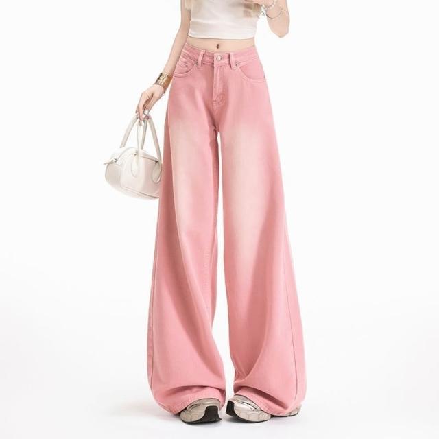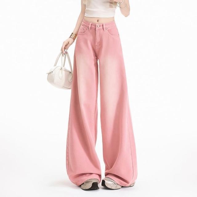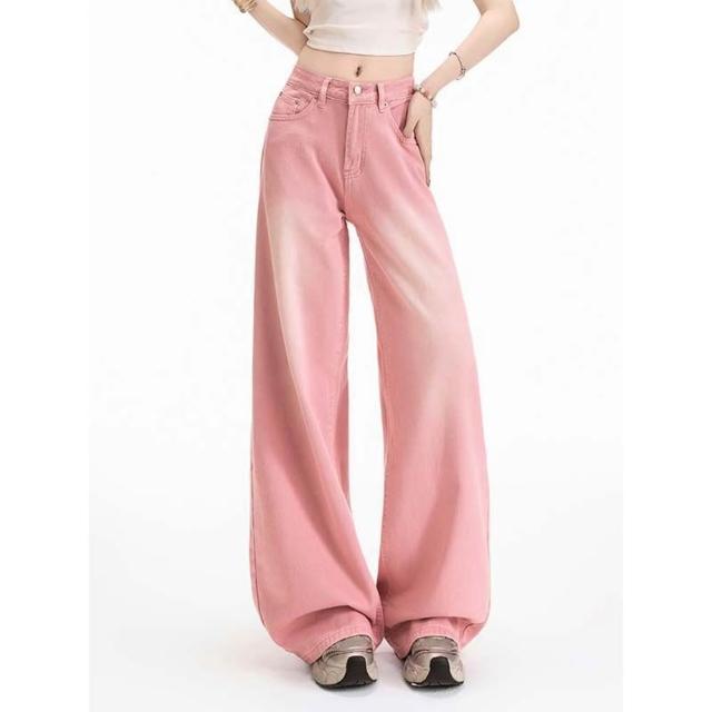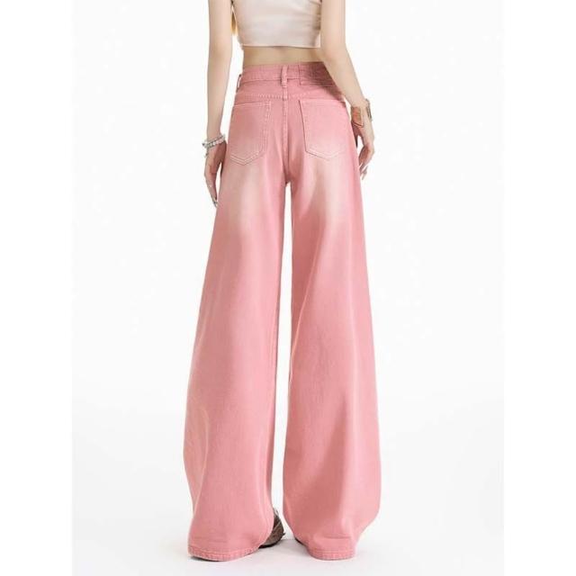 限時下殺 牛仔褲 彎刀褲女 長褲 女裝 美式粉色磨白漸變闊腿牛仔褲女夏新款高腰寬鬆直筒薄款休閒褲子