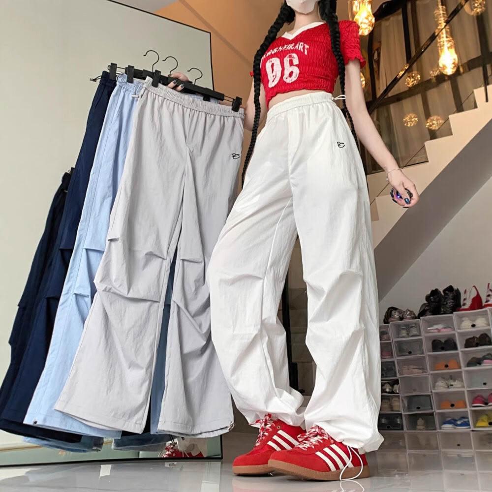 🚀虧本衝評&限時下殺🔥休閒褲 下著 長褲 女裝 美式復古褶皺白色運動風刺繡降傘兵工裝褲女夏季新款寬鬆休閒長褲