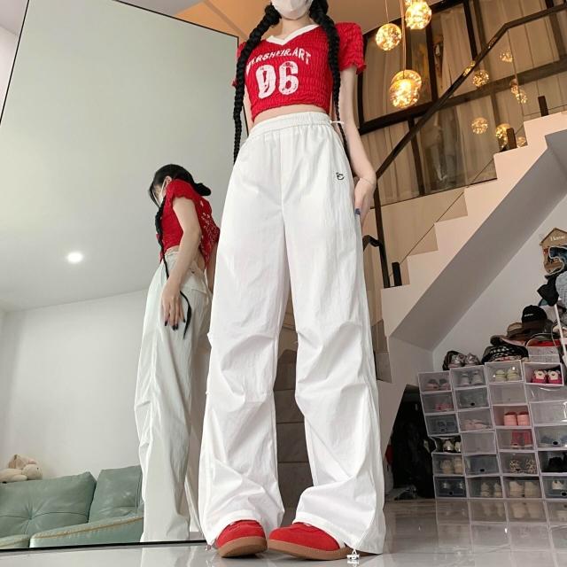 🚀虧本衝評&限時下殺🔥休閒褲 下著 長褲 女裝 美式復古褶皺白色運動風刺繡降傘兵工裝褲女夏季新款寬鬆休閒長褲