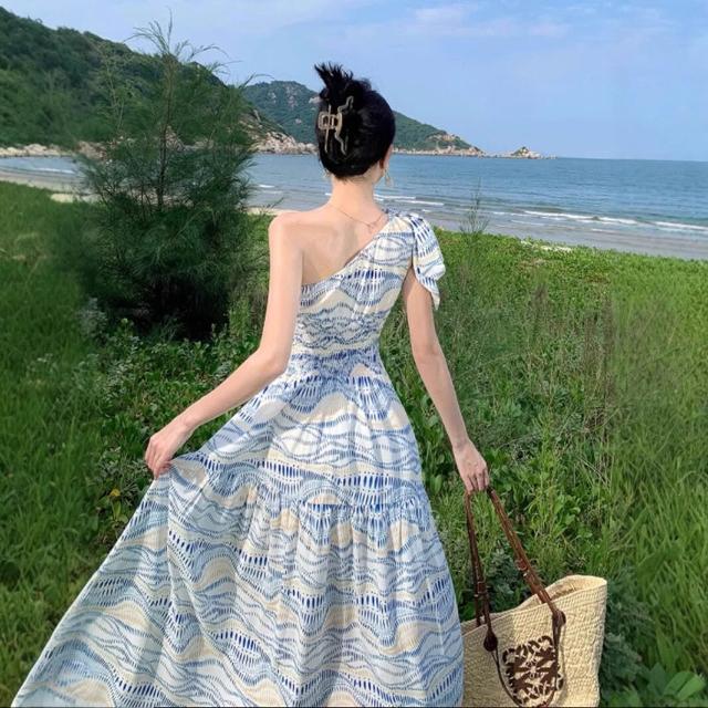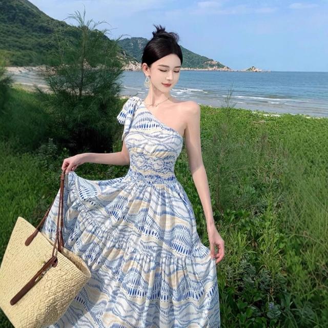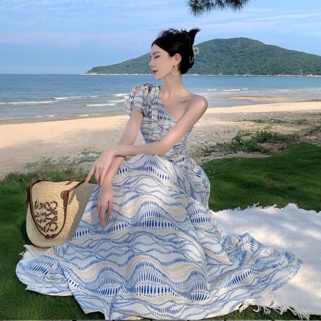 限時下殺 洋裝 連身裙 連衣裙 夏季女裝 裙子 旅遊拍照斜肩連衣裙小眾設計感氣質收腰裙子度假沙灘長裙