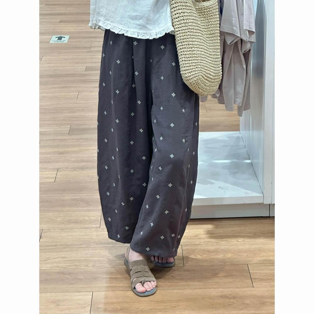 免運 免稅 冰絲感!2025夏刺繡亞麻闊腿褲女薄款褲子白色九分褲灰色九分褲