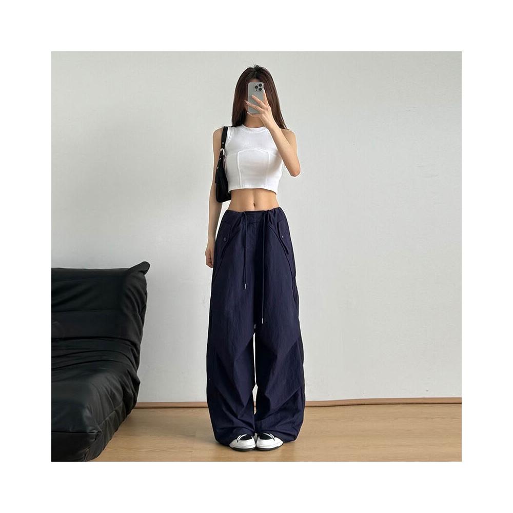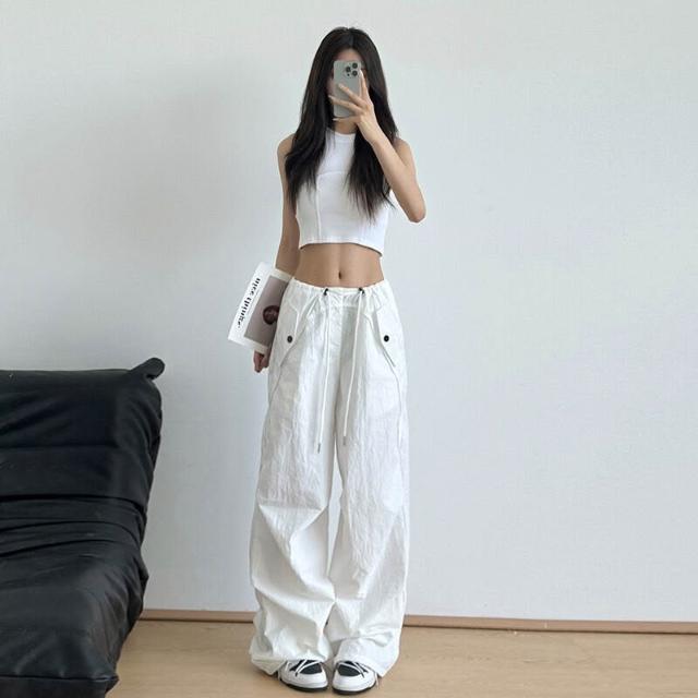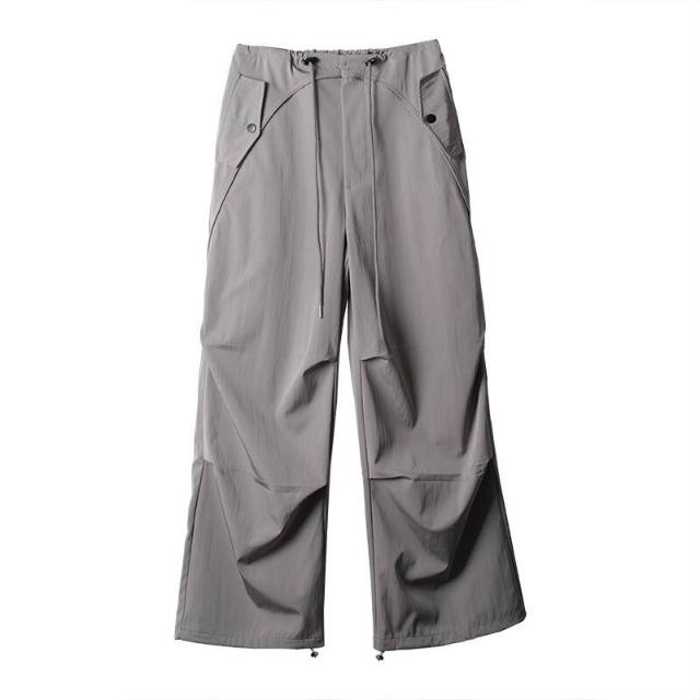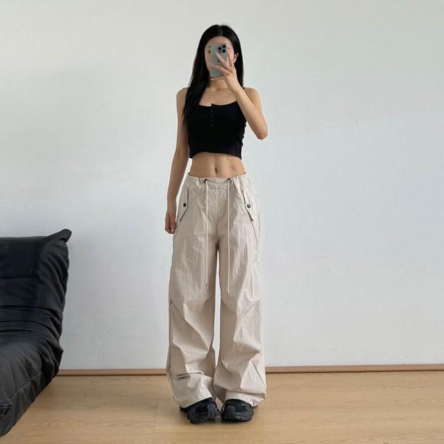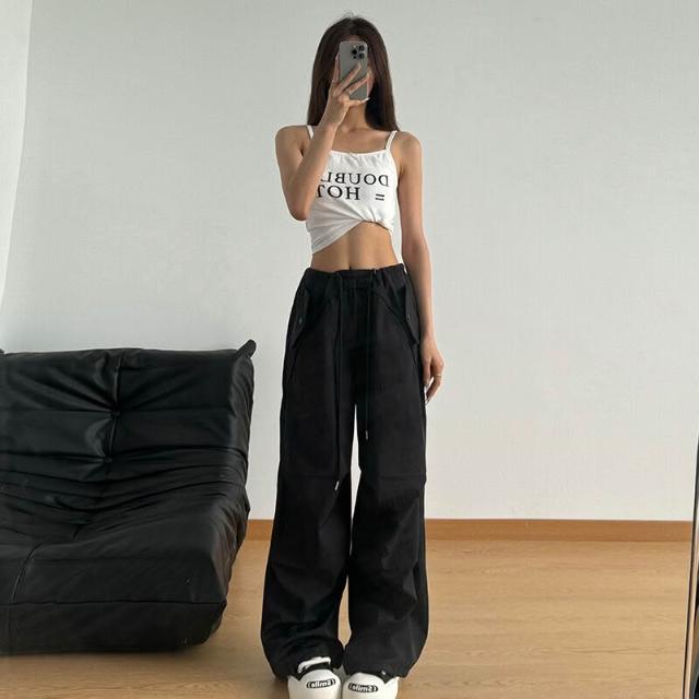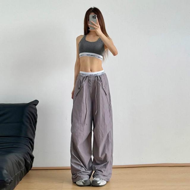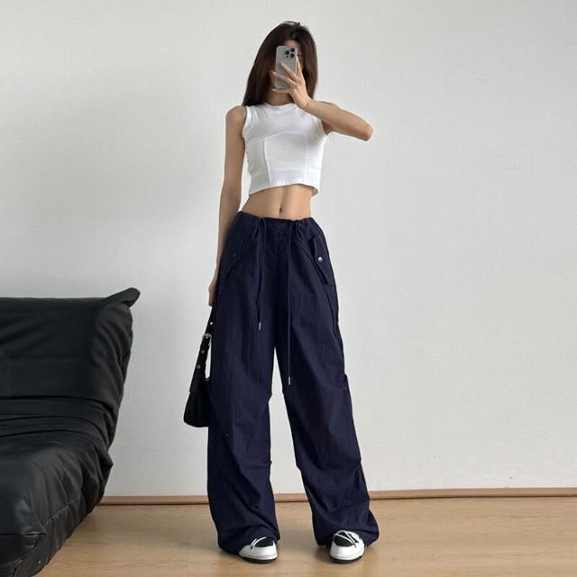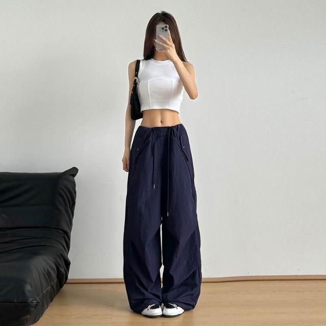 免運 免稅 美式抽繩高腰束腳降落傘褲女夏季薄款褶皺防曬速幹沖鋒闊腿工裝褲