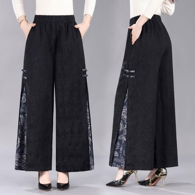 免運 免稅 新款春秋媽媽民族繡花刺繡復古闊腿褲棉麻寬松中老年女褲褲子長褲