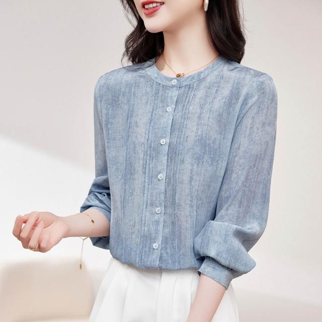 免運 免稅 杭州真絲襯衫女2026新款早春圓領洋氣休閑減齡開衫牛仔桑蠶絲上衣