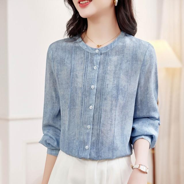 免運 免稅 杭州真絲襯衫女2026新款早春圓領洋氣休閑減齡開衫牛仔桑蠶絲上衣