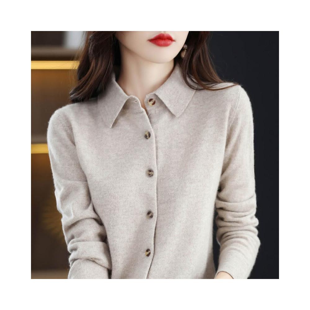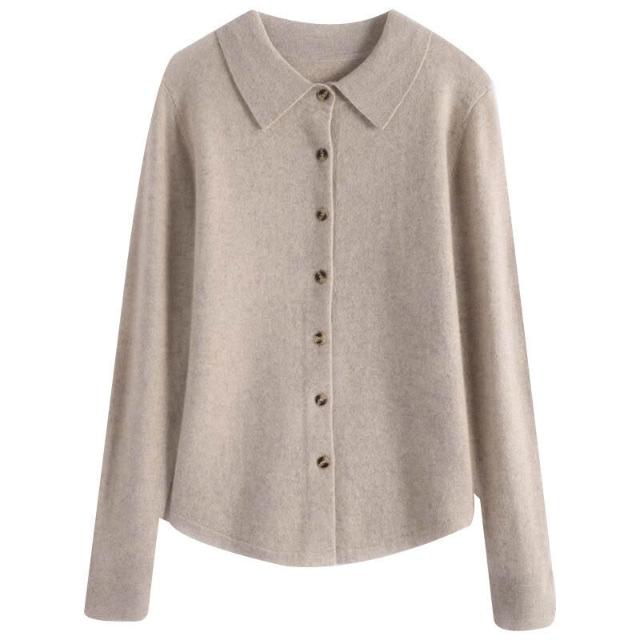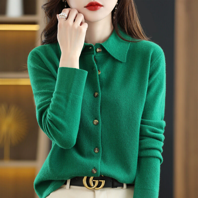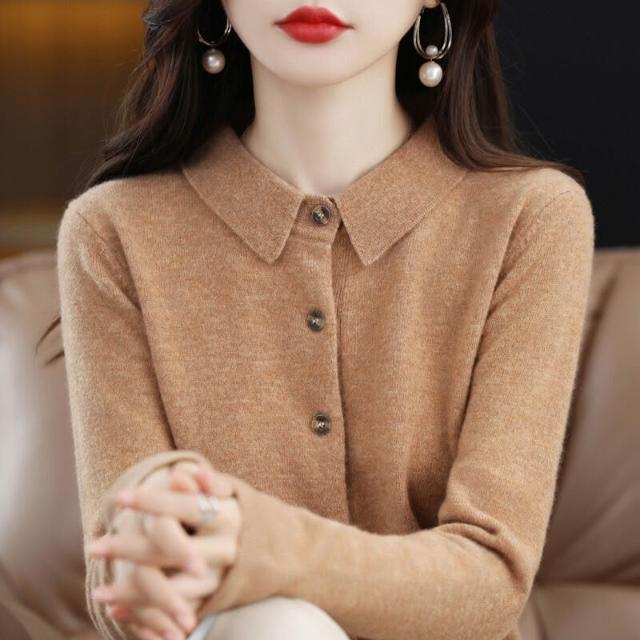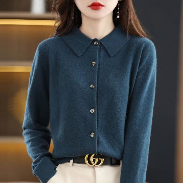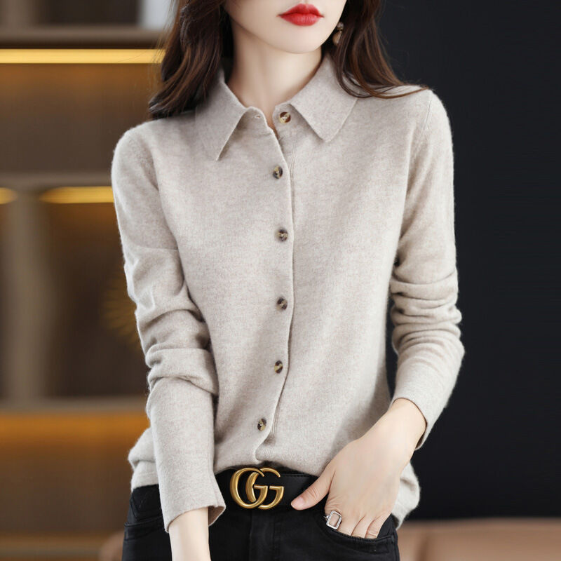 免運 免稅 秋冬100%純羊毛針織襯衫女外套POLO領打底衫羊絨毛衣開衫翻領外搭