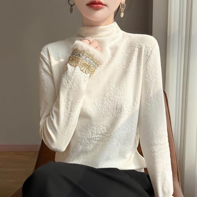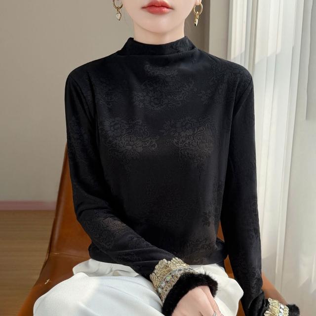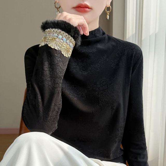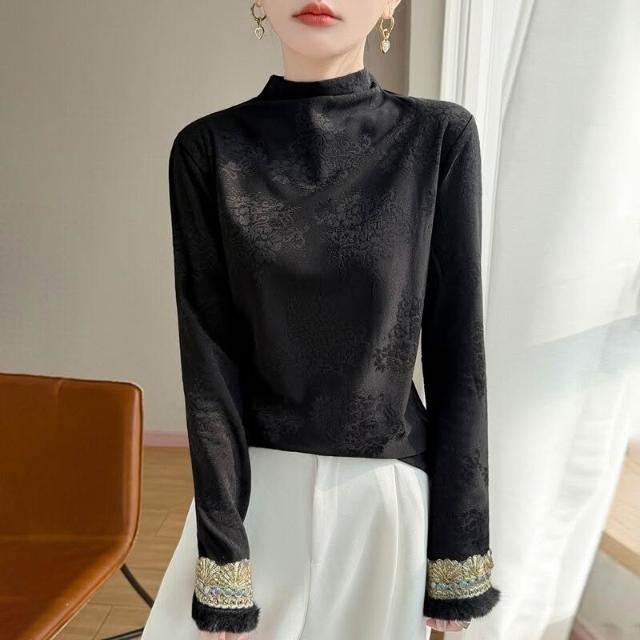 免運 免稅 新中式刺繡加絨半高領氣質保暖打底衫女國風提花秋冬加厚針織毛衣