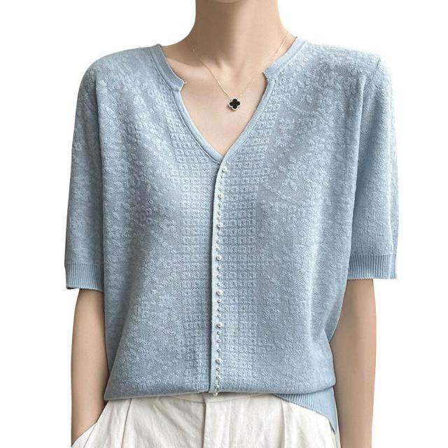 免運 免稅 夏季新款短袖冰絲t恤女裝V領釘珠洋氣質小衫百搭镂空鉤花針織上衣