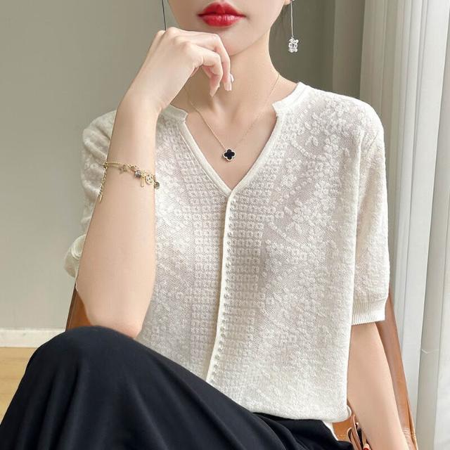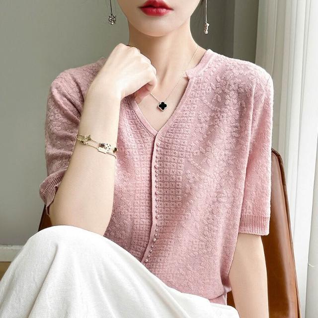 免運 免稅 夏季新款短袖冰絲t恤女裝V領釘珠洋氣質小衫百搭镂空鉤花針織上衣