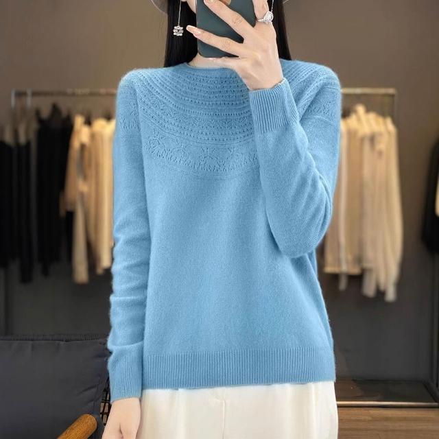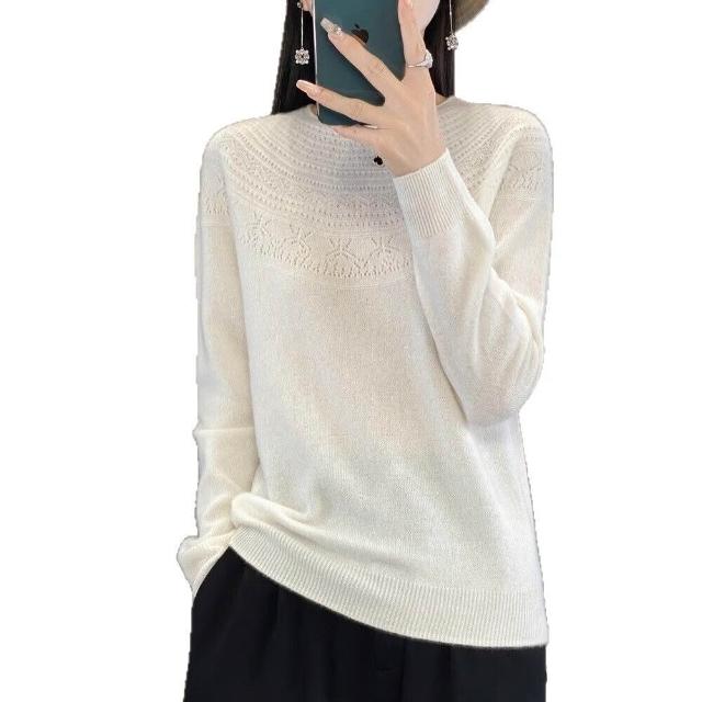 免運 免稅 跨境秋冬新款安迪絨針織衫女圓領一線成衣镂空套頭毛衣女打底