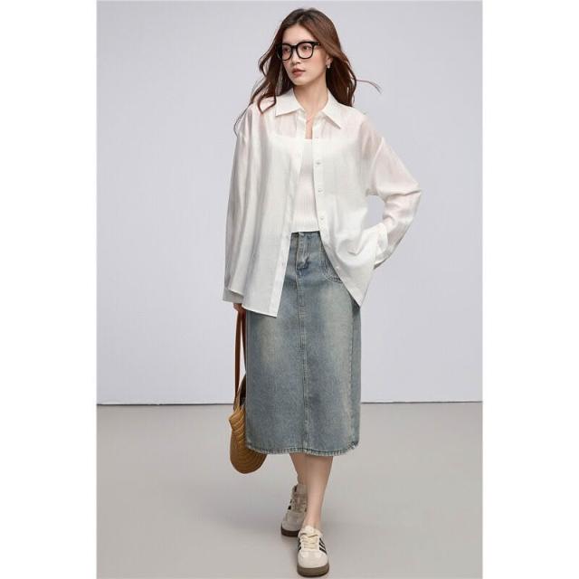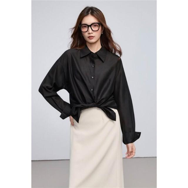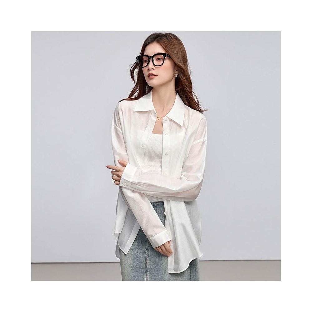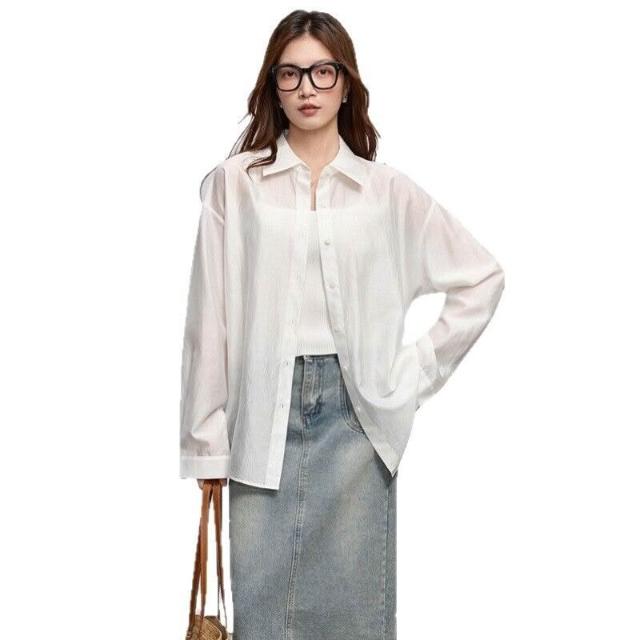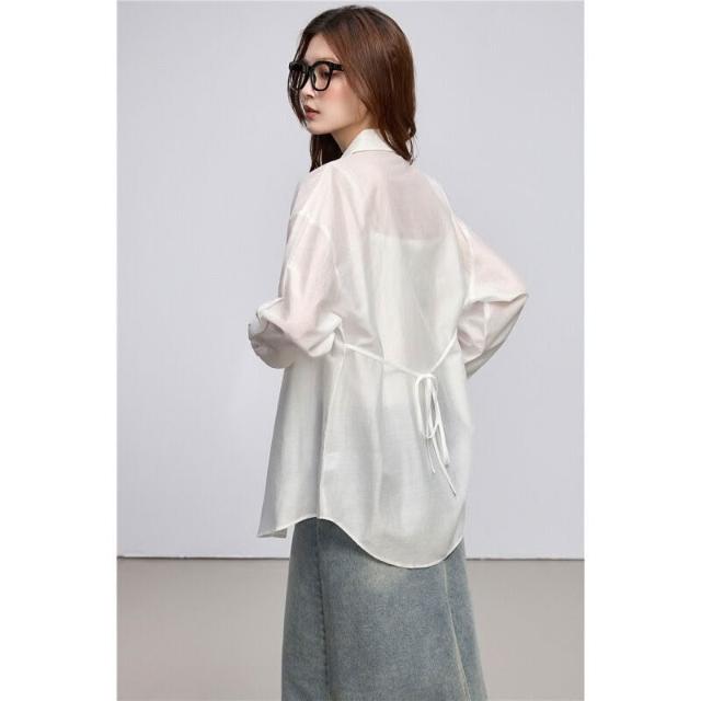 免運 免稅 實拍白色長袖防曬襯衫女夏季開衫綁帶小眾天絲薄款寬松上衣
