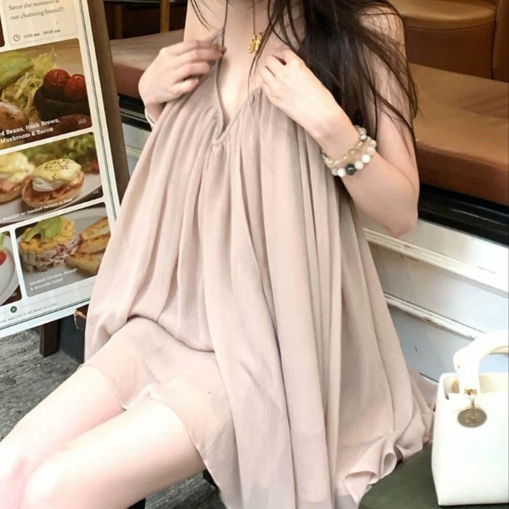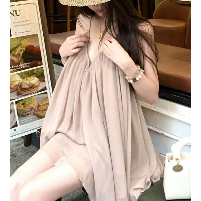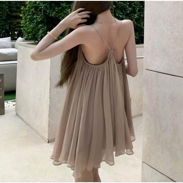 免運 免稅 姐浪漫匿名雪紡連衣裙夏季短款露背度假風掛脖吊帶裙