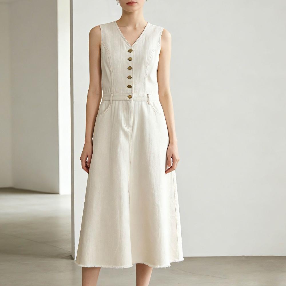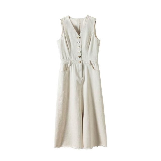免運 免稅 米白色小香風無袖背心連衣裙女夏新款感法式氣質牛仔中長裙子