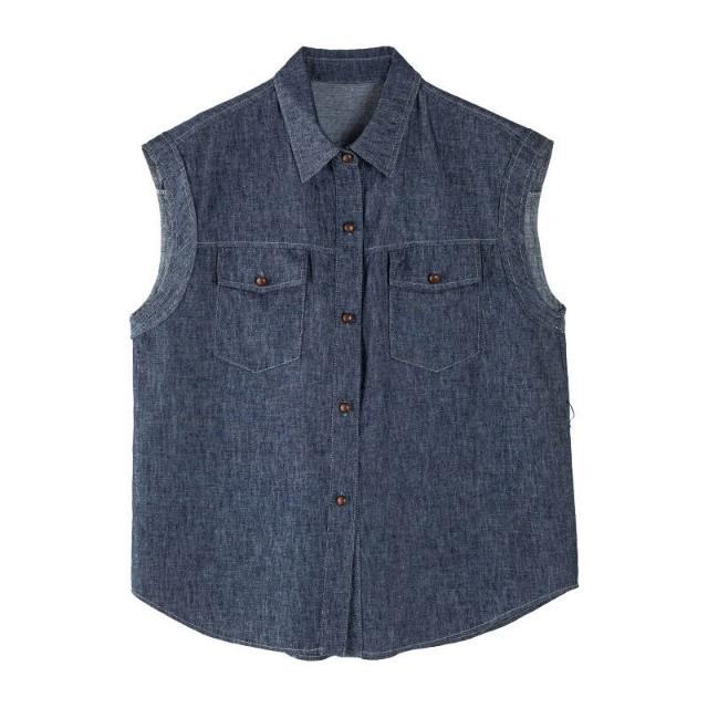 免運 免稅 棉麻翻領單排扣無袖馬甲牛仔襯衫女上衣夏季2026新款簡約百搭