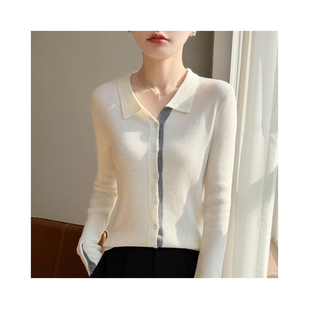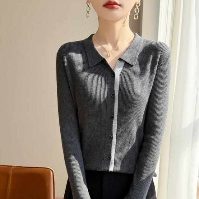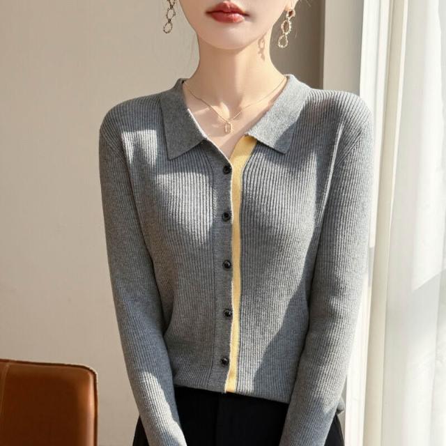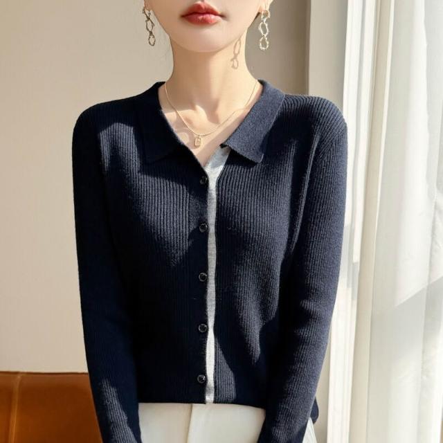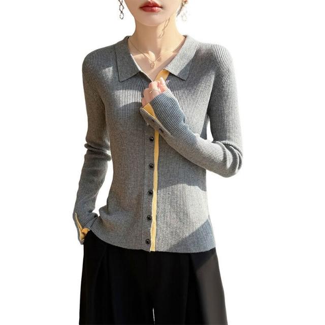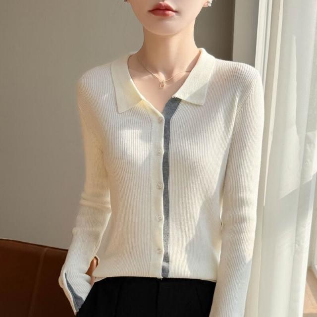 免運 免稅 2026年春秋新款蠶絲羊毛Polo領針織開衫女拼色修身顯瘦上衣外套