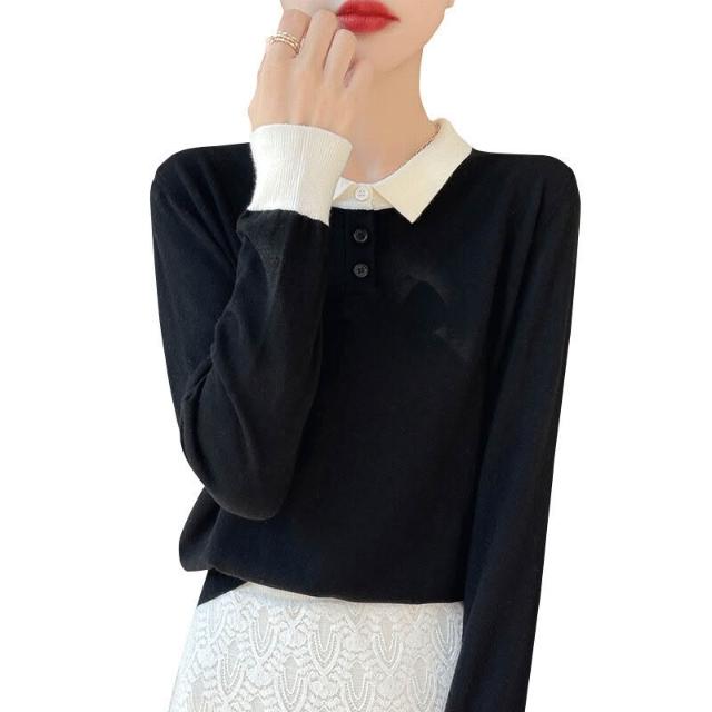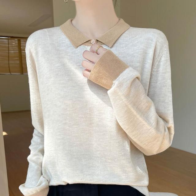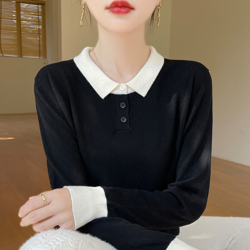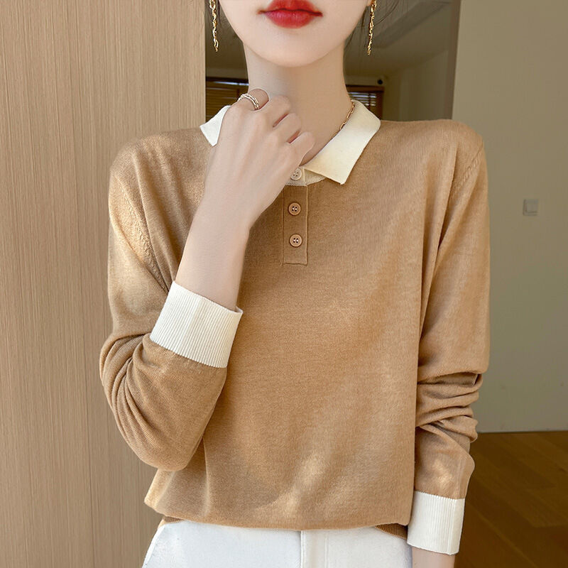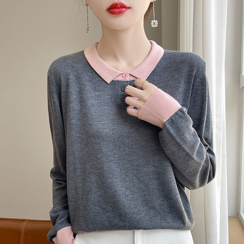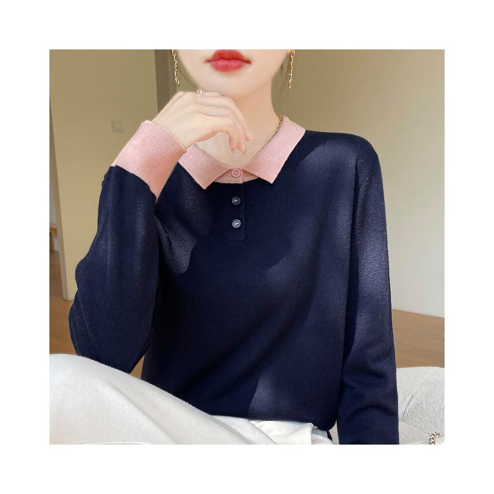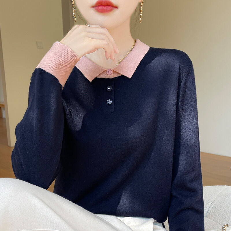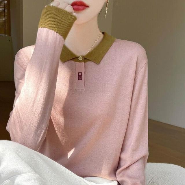 免運 免稅 2026年早春新款精紡羊毛POLO領撞色針織衫長袖女寬松上衣