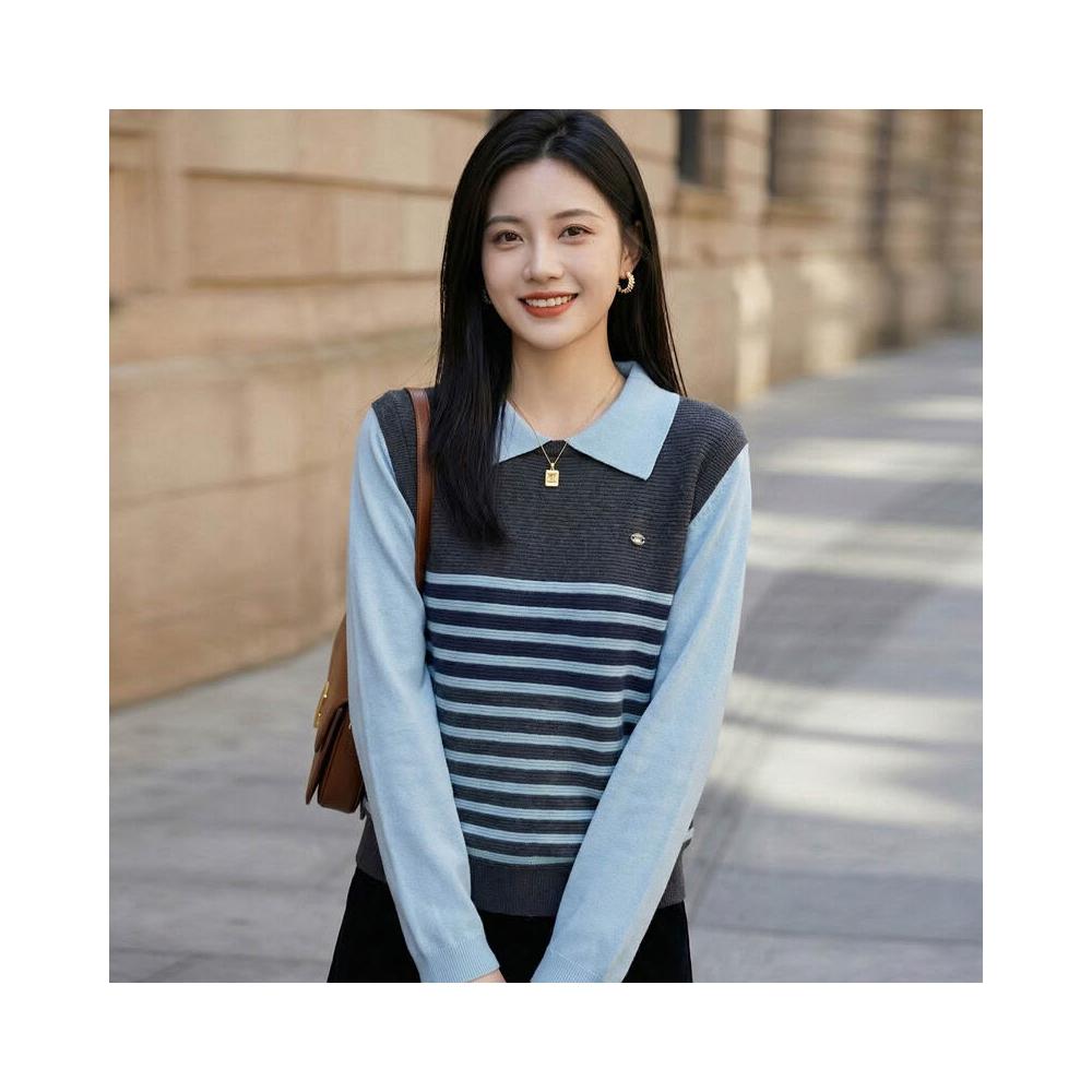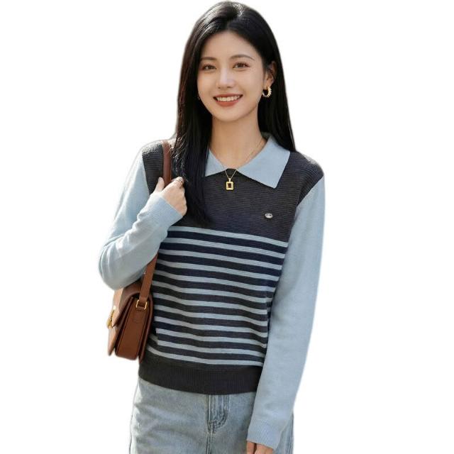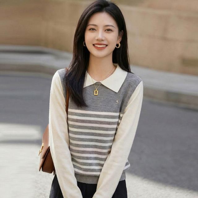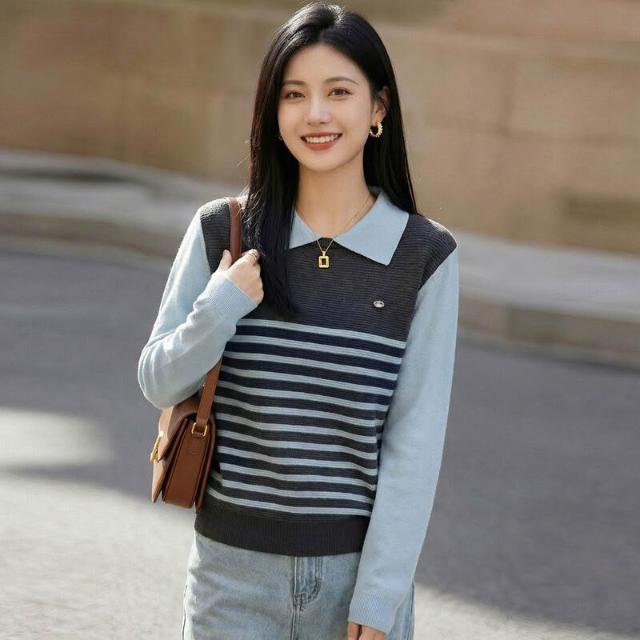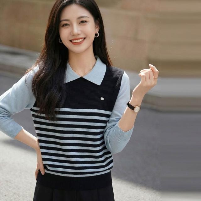 免運 免稅 2026年春秋新款蠶絲羊毛Polo領針織衫長袖女拼色條紋寬松假兩件