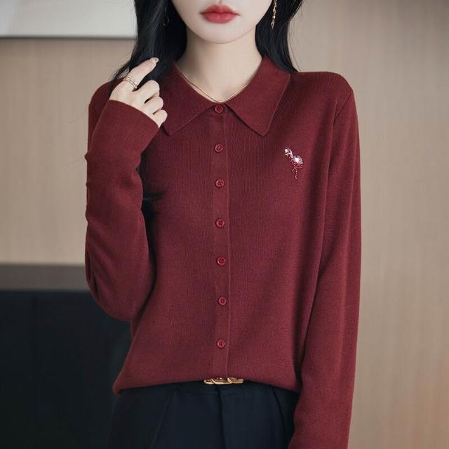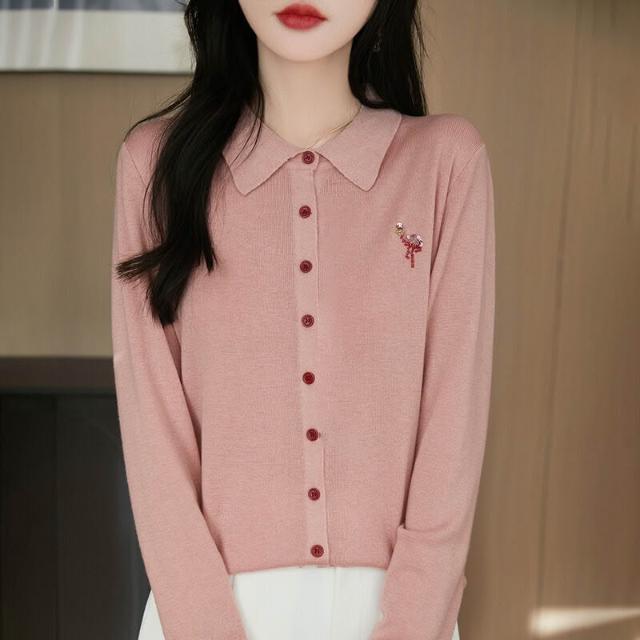 免運 免稅 16針精紡羊毛POLO領針織開衫2026年春季新款火烈鳥亮片刺繡上衣女