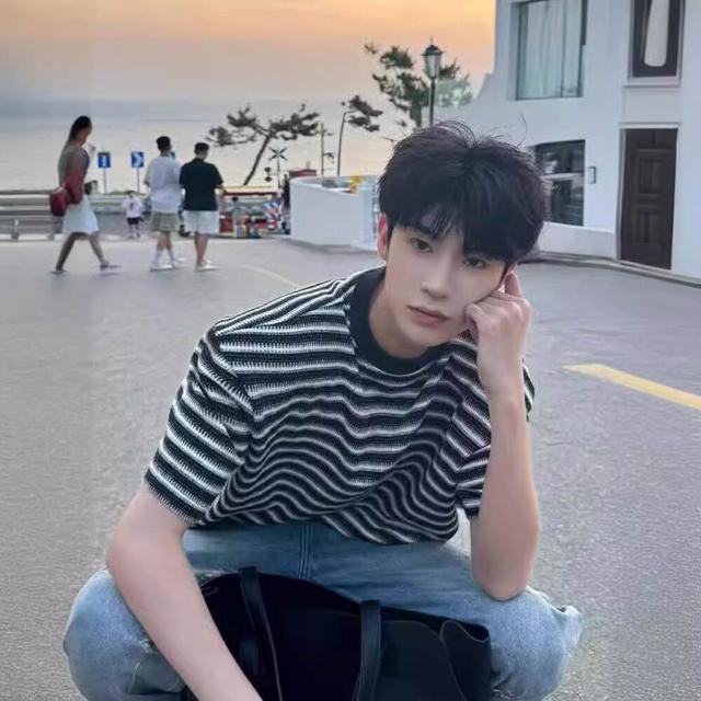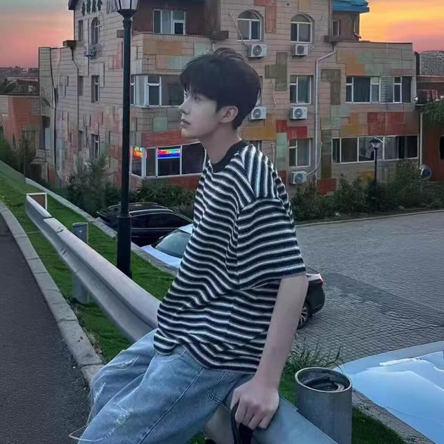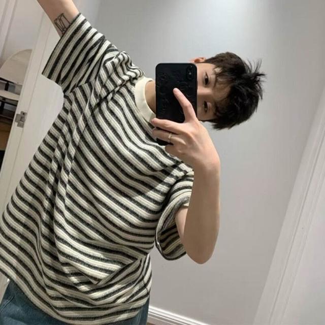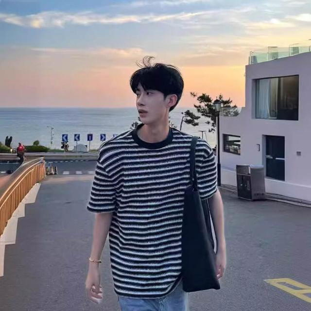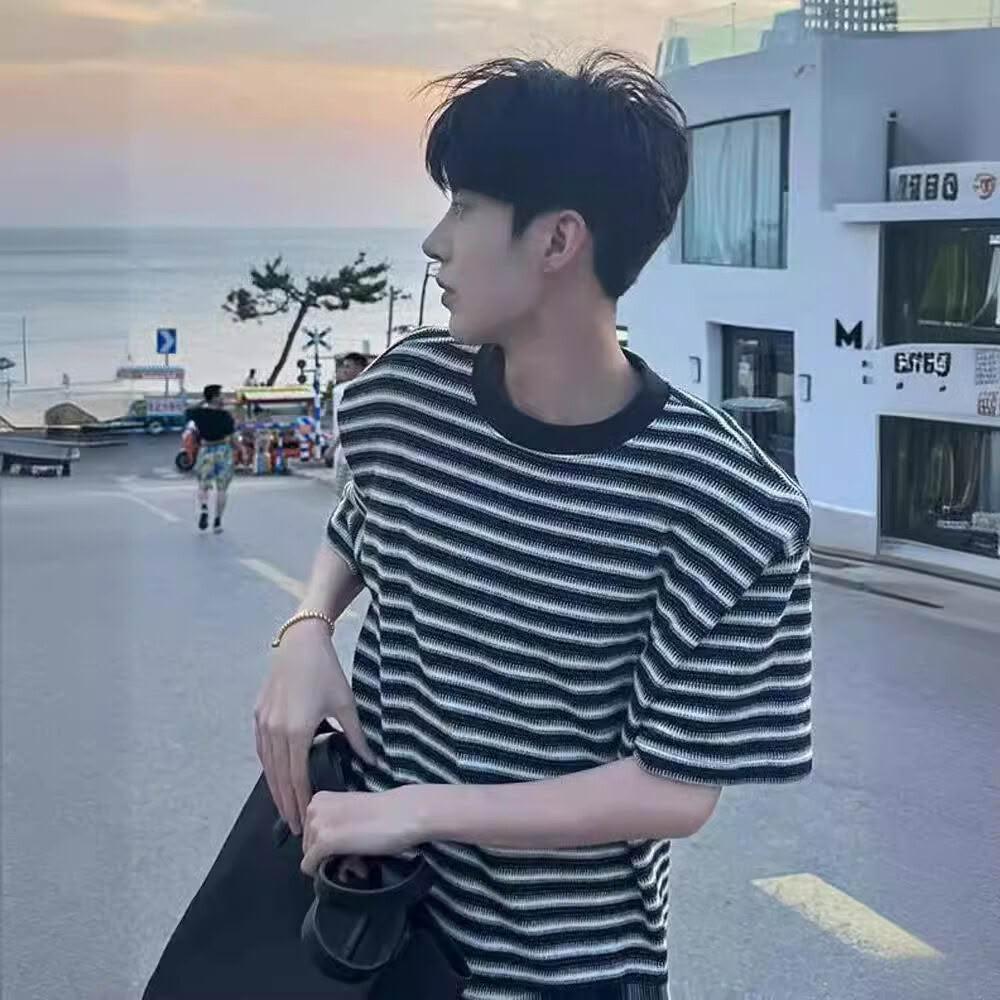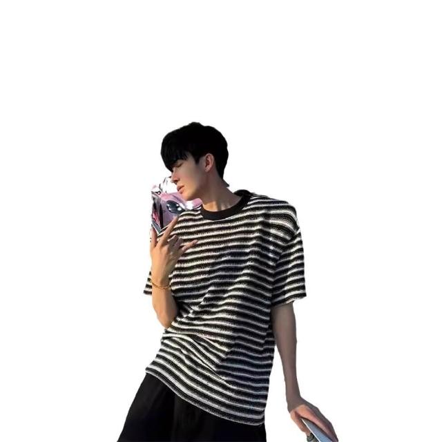 免運 免稅 黑白條紋針織短袖男款夏季潮牌美式重磅正肩t恤小領口五分袖體恤