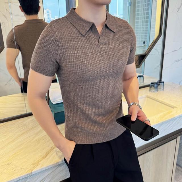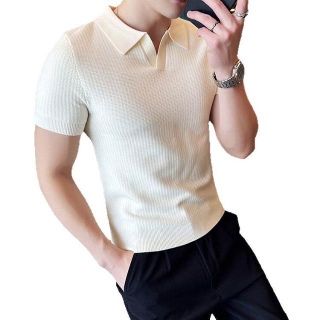 免運 免稅 POLO衫V領短袖針織衫男修身商務夏季冰絲透氣韓版潮外貿跨境批發