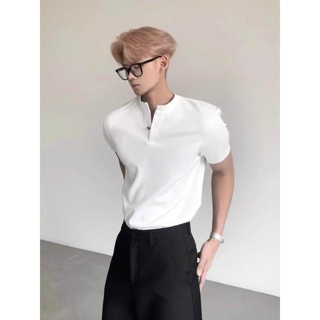 免運 免稅 白色亨利領正肩T恤男款夏季美式潮牌小眾痞帥高級感v領短袖polo衫