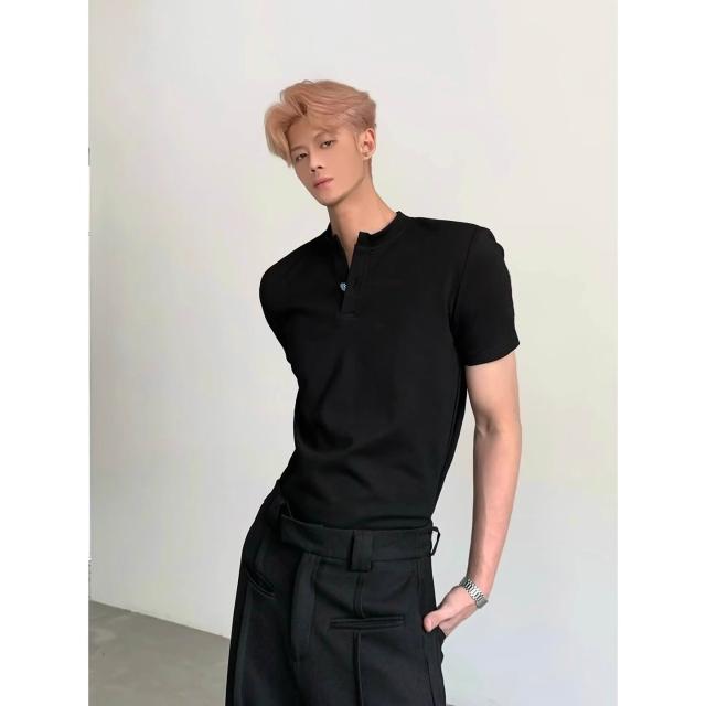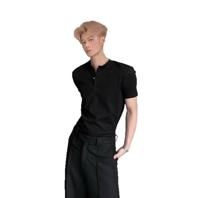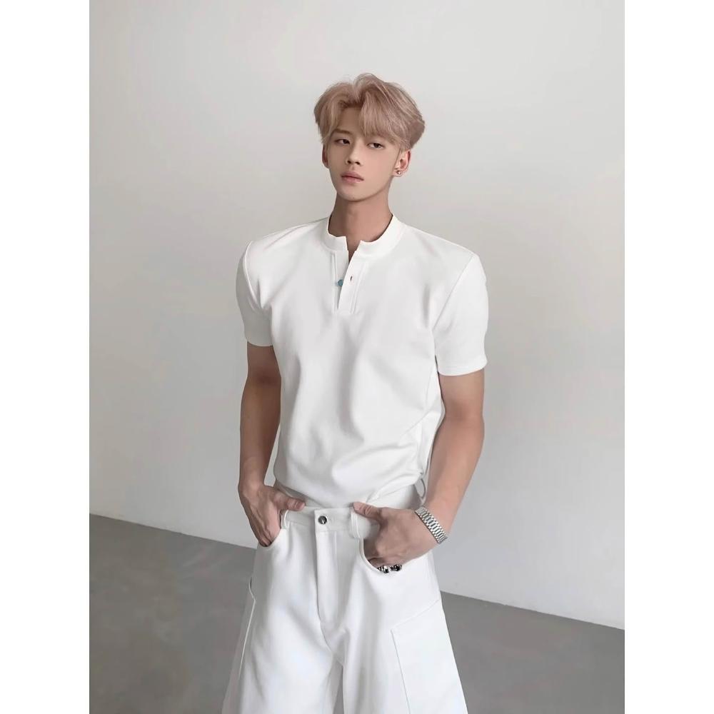 免運 免稅 白色亨利領正肩T恤男款夏季美式潮牌小眾痞帥高級感v領短袖polo衫
