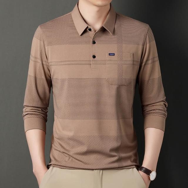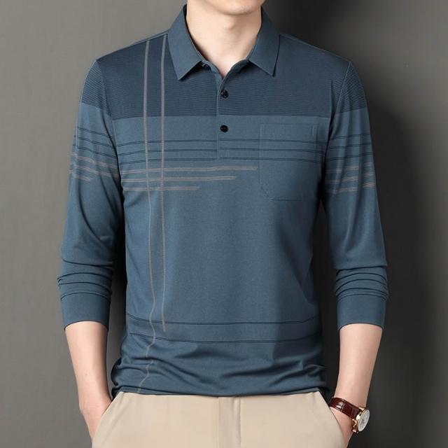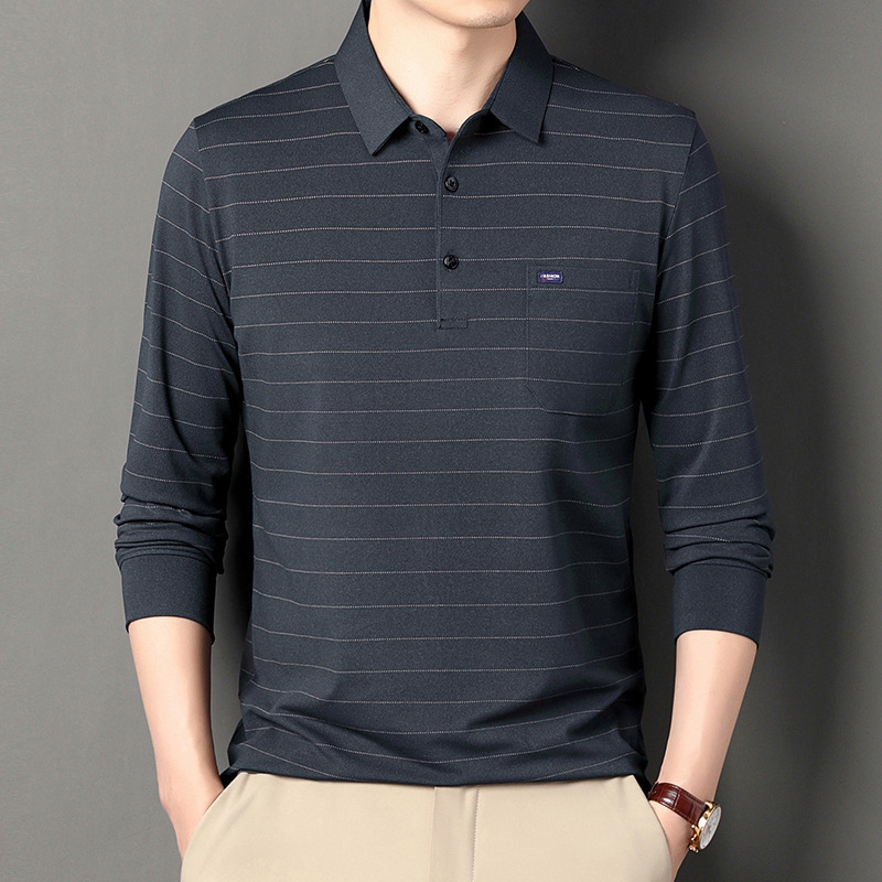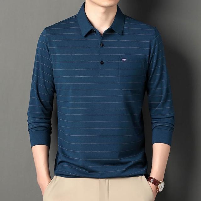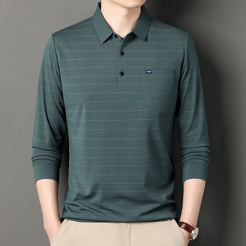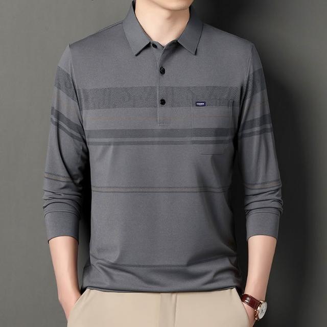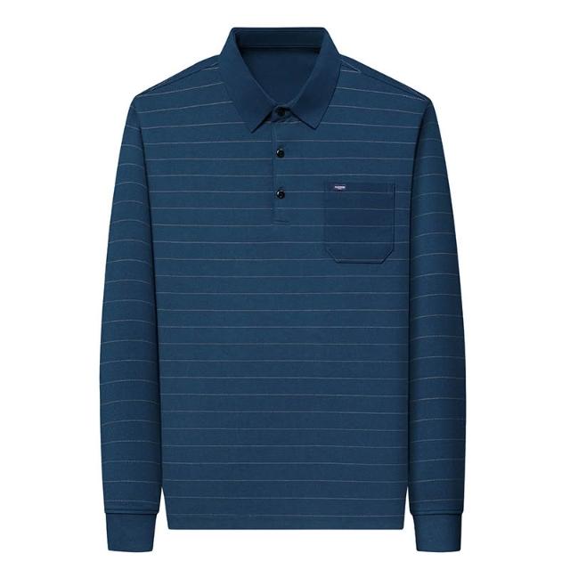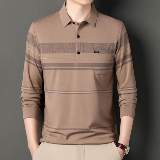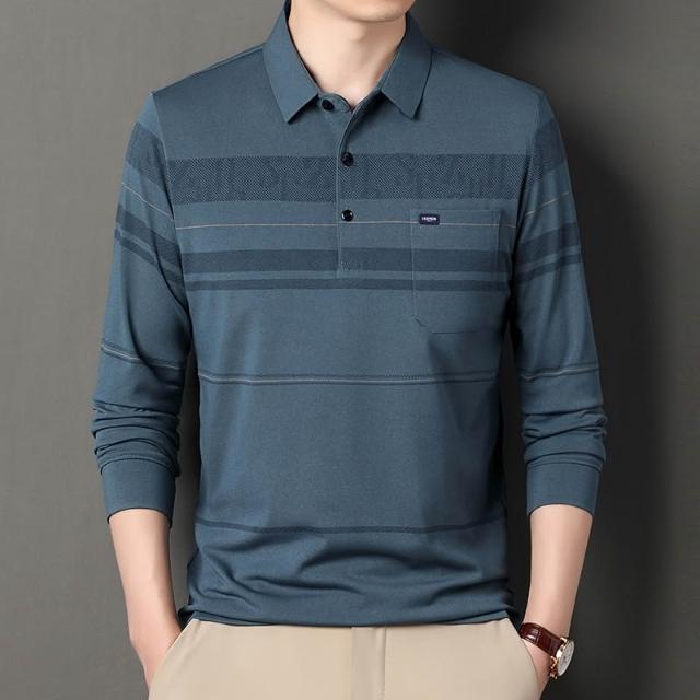 免運 免稅 爸爸春裝翻領長袖t恤中老年人男裝真口袋上衣條紋有兜男式polo衫