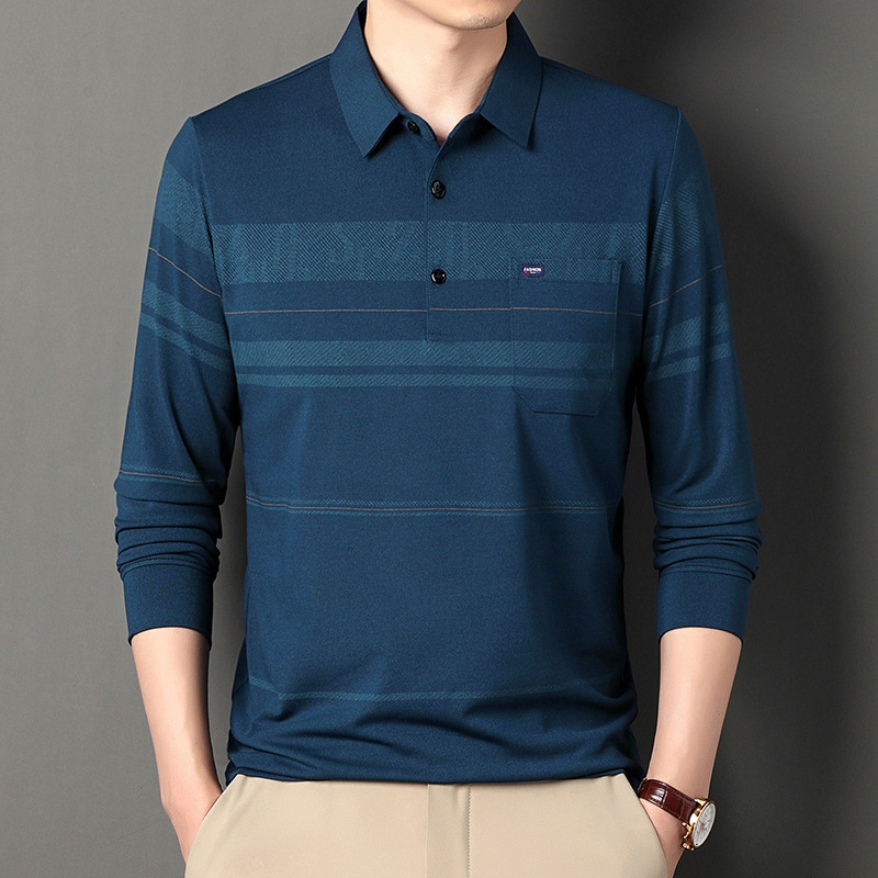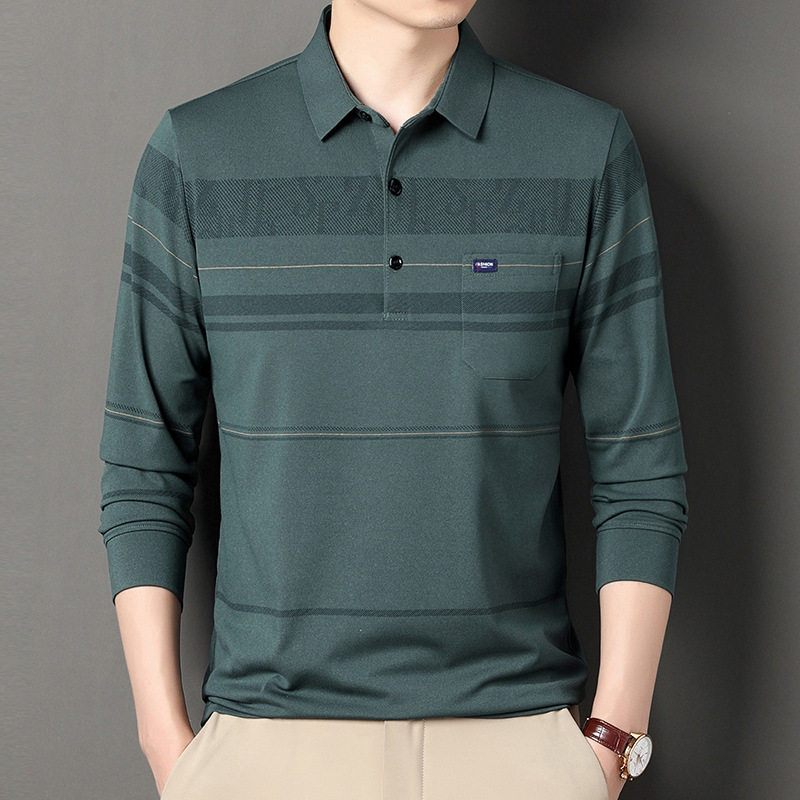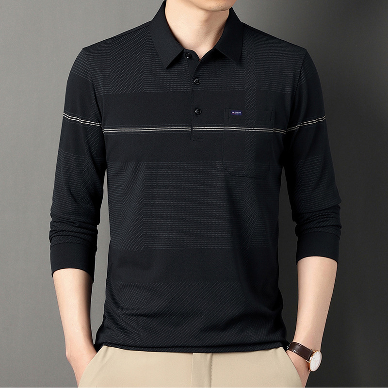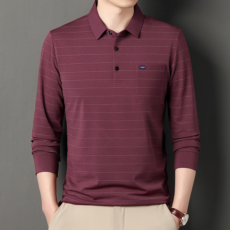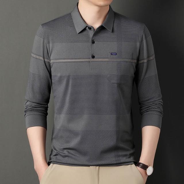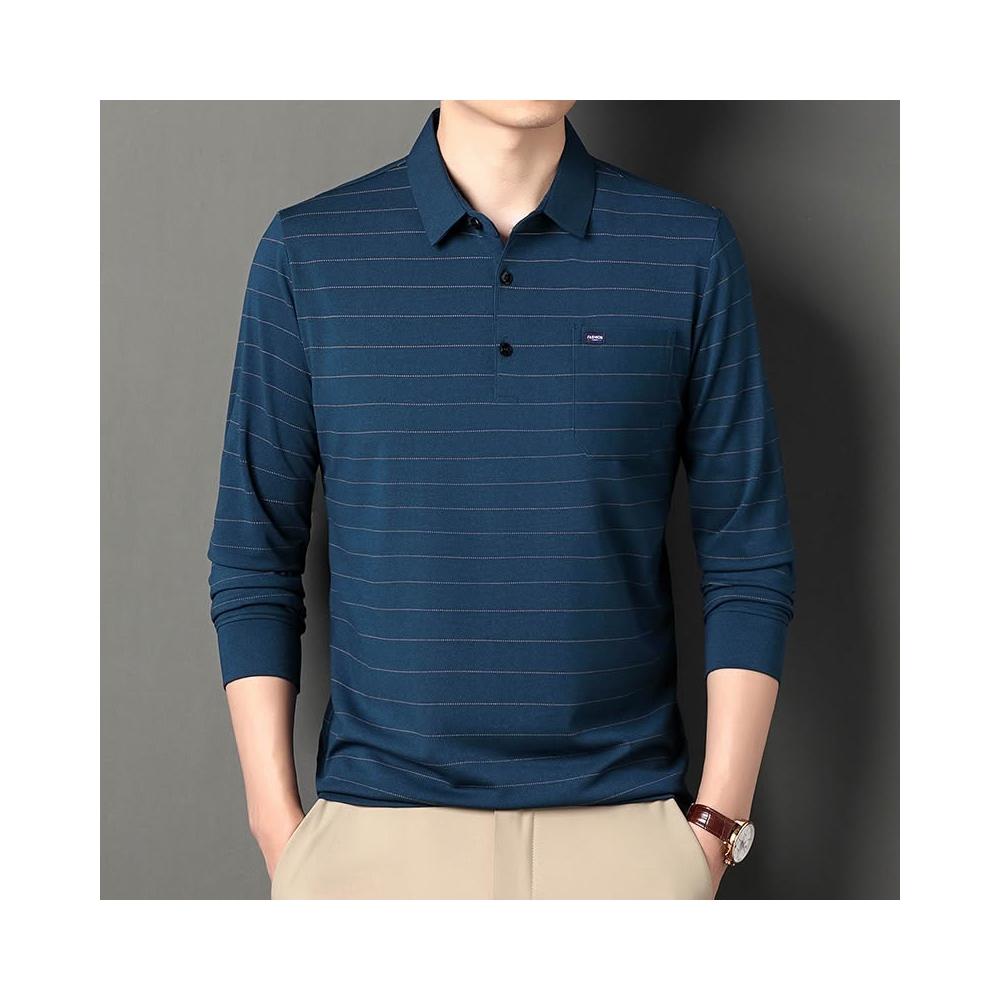 免運 免稅 爸爸春裝翻領長袖t恤中老年人男裝真口袋上衣條紋有兜男式polo衫