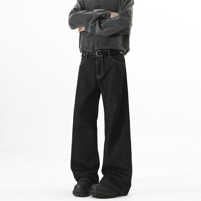 免運 免稅 丹寧原色闊腿牛仔褲男秋季美式高街寬松長褲cleanfit水洗拖地褲子