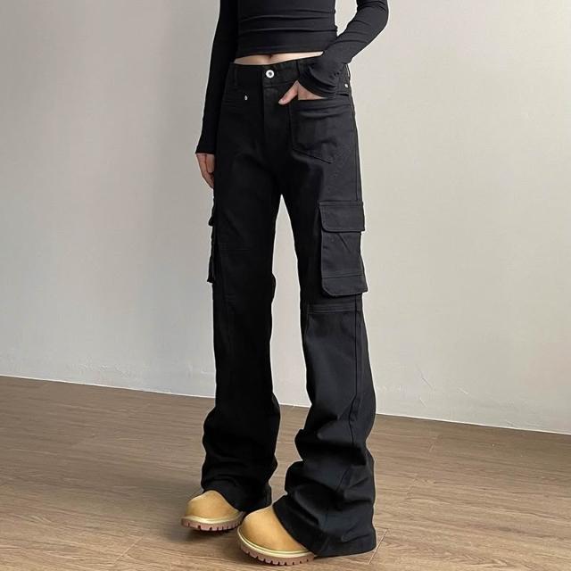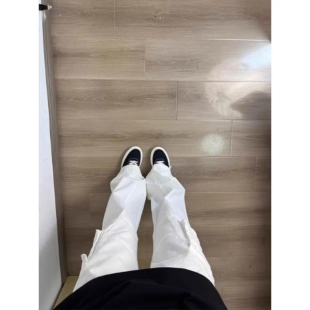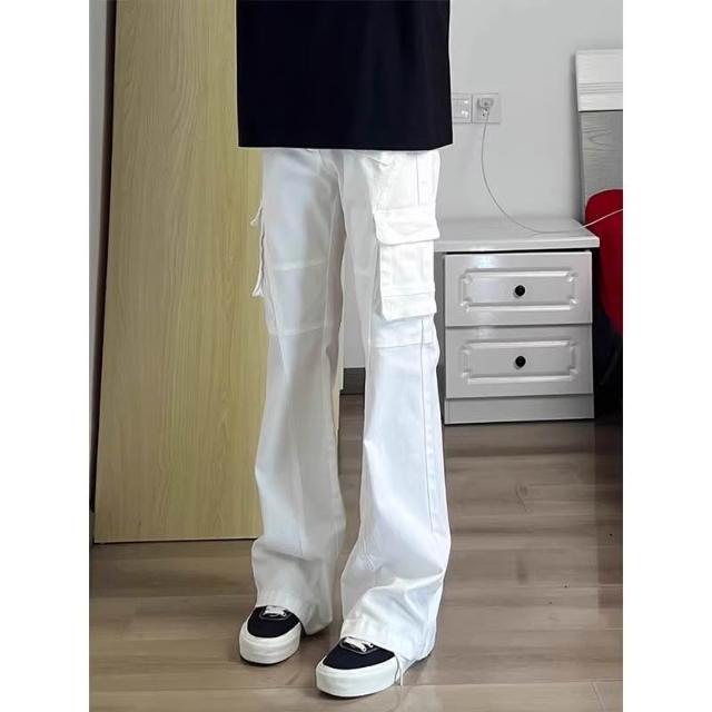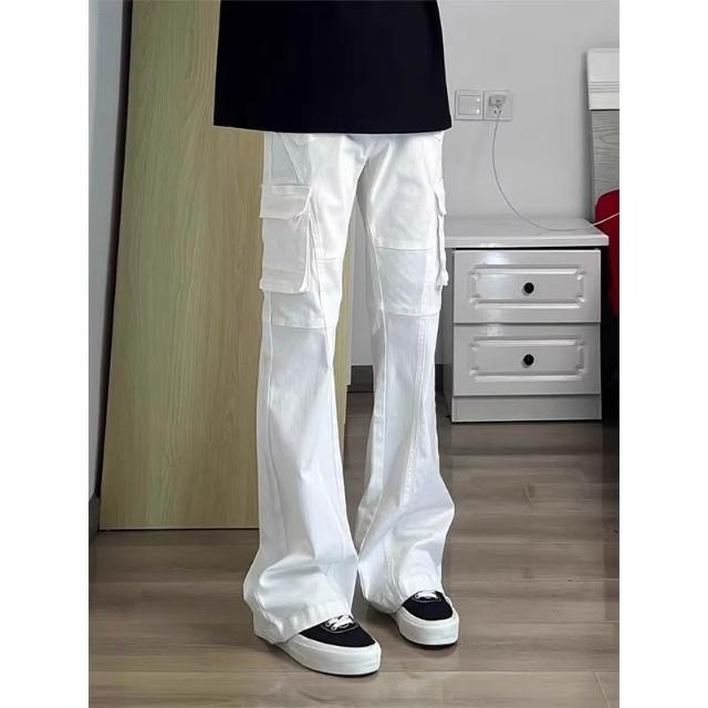 免運 免稅 白色結構拼接彎刀牛仔褲男夏季美式復古直筒微喇工裝褲子2026新款