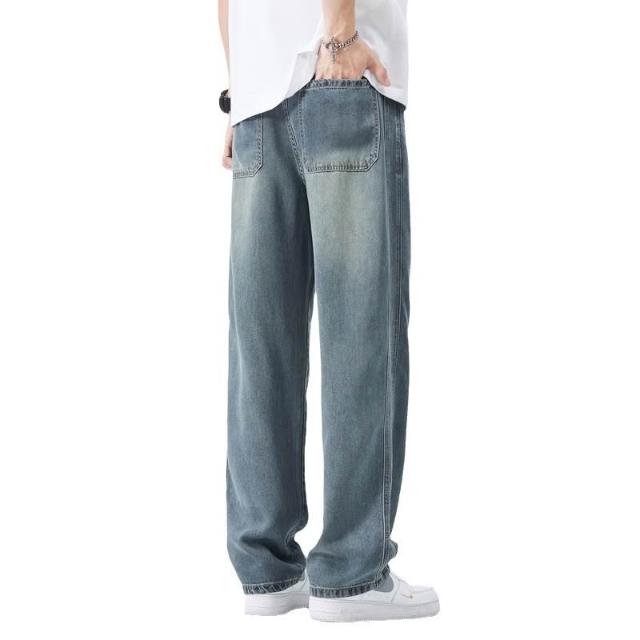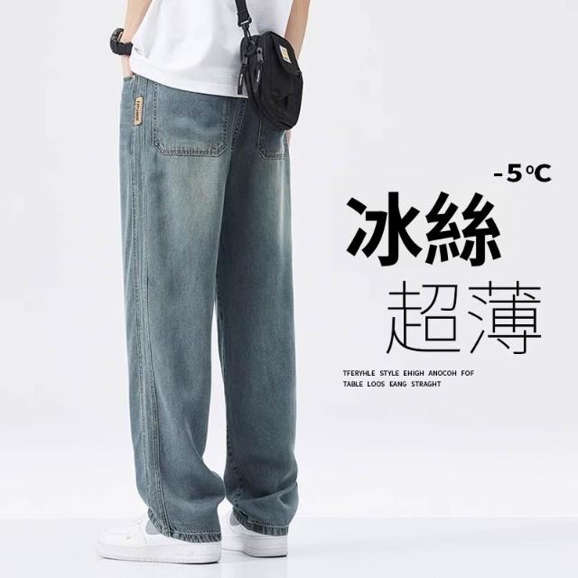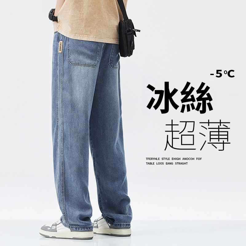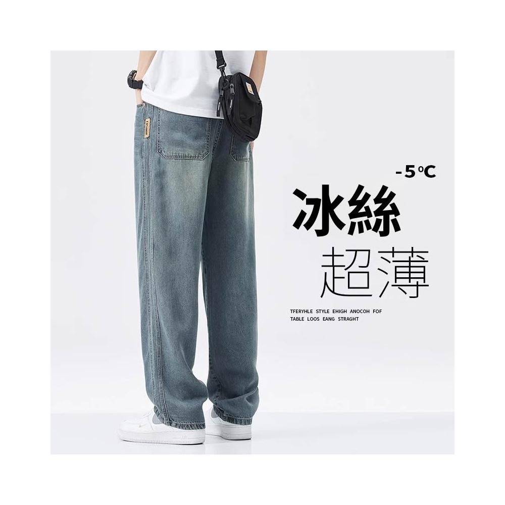 免運 免稅 夏季薄款冰絲牛仔褲男士寬松直筒潮牌冰氧吧天絲涼感休閑闊腿長褲