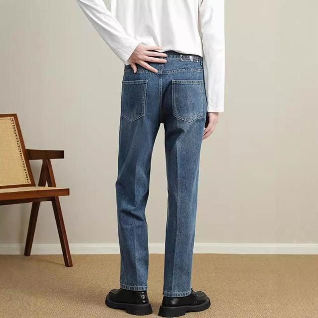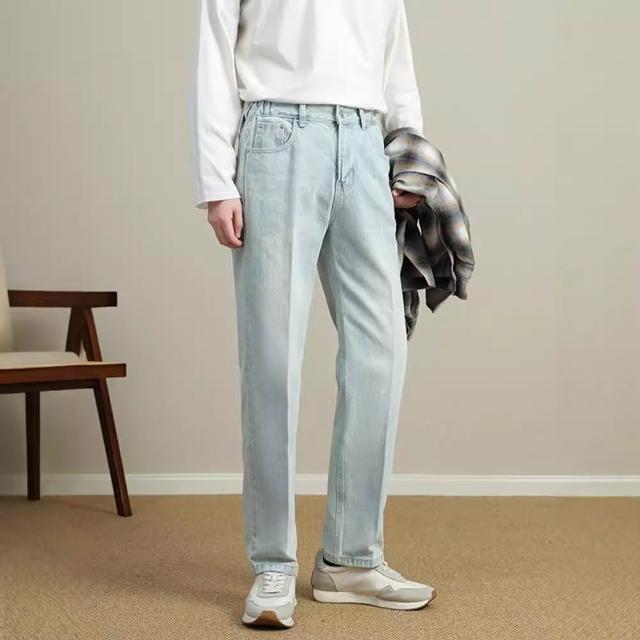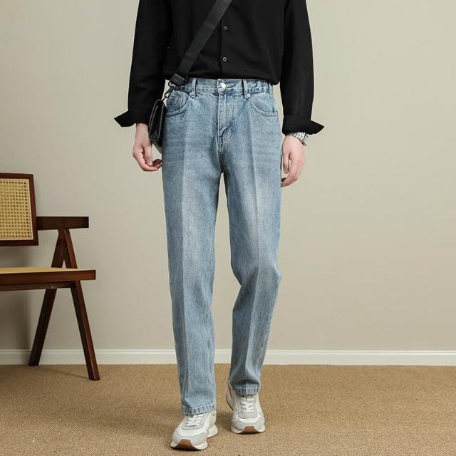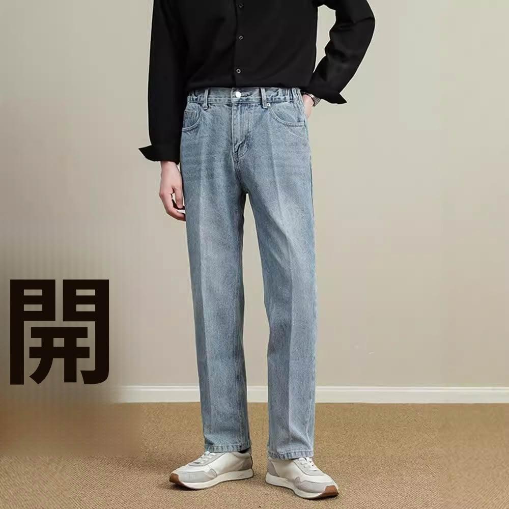 免運 免稅 韓系穿搭春秋款淺色牛仔褲男士港風簡約松緊腰錐形直筒休閑褲