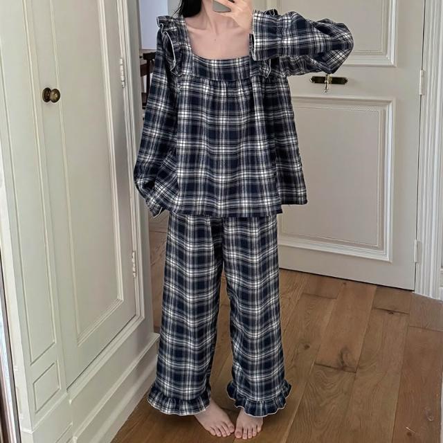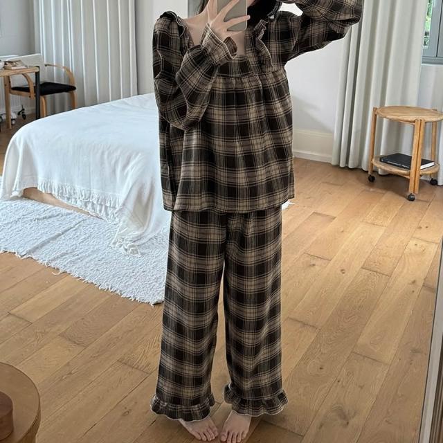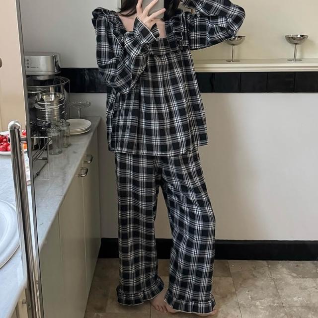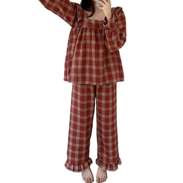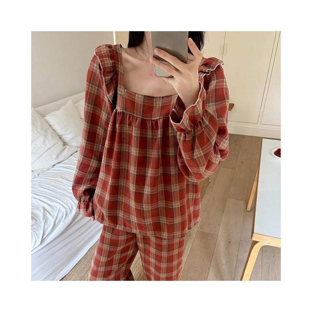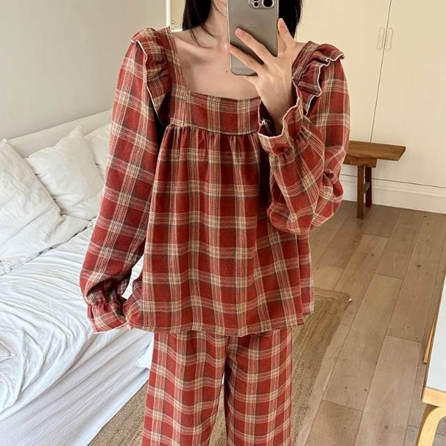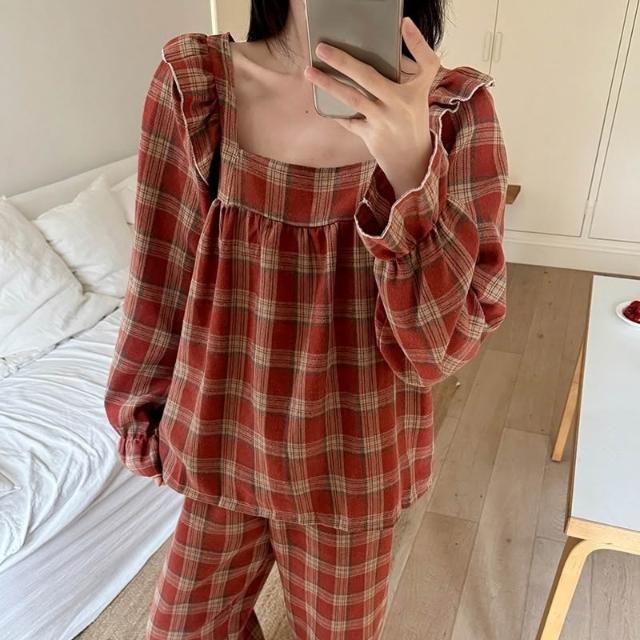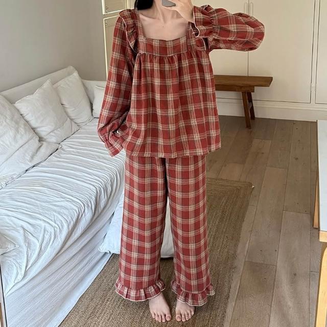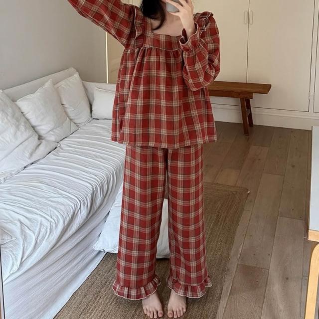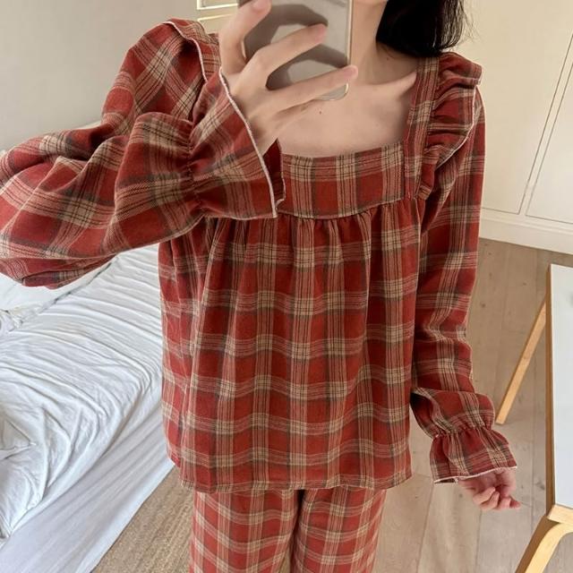 免運 免稅 實體批發現貨新款韓版紅格紋ins睡衣女春秋可愛風長袖款一件代發