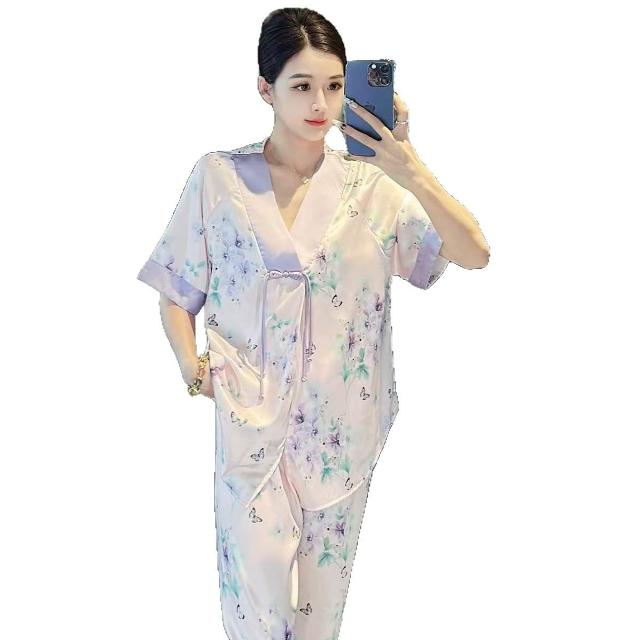 免運 免稅 夏季冰絲睡衣女短袖長褲新中式國風印花套頭家居服套裝女可外穿