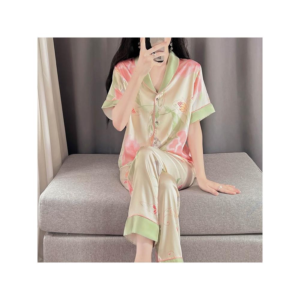 免運 免稅 新中式高級感小翻領甜美碎花冰絲睡衣女短袖長褲家居服開衫家居服