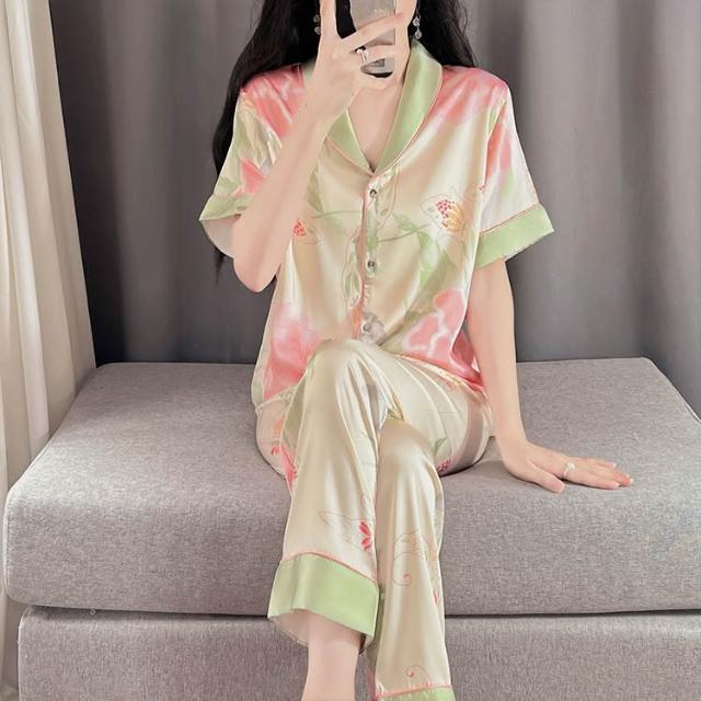 免運 免稅 新中式高級感小翻領甜美碎花冰絲睡衣女短袖長褲家居服開衫家居服