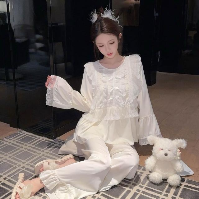 免運 免稅 2026春夏季冰絲薄款長袖套裝白色睡衣女宮廷家居服女士公主風蕾絲