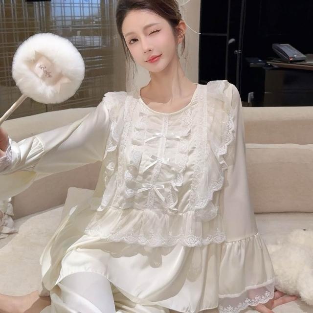免運 免稅 2026春夏季冰絲薄款長袖套裝白色睡衣女宮廷家居服女士公主風蕾絲