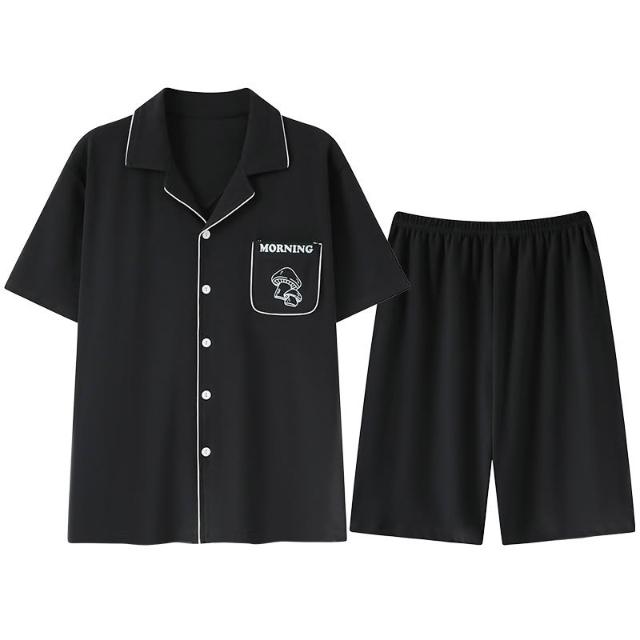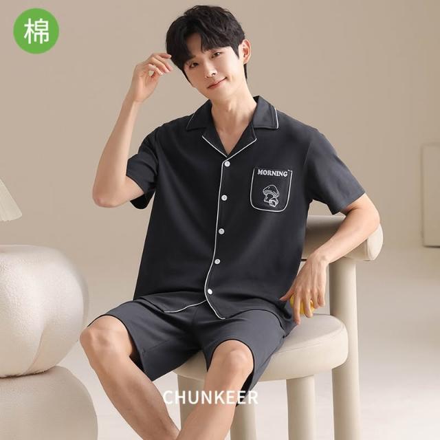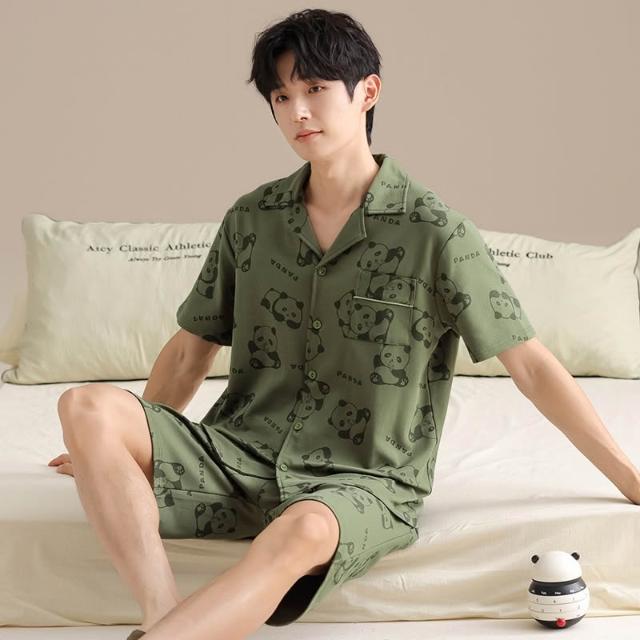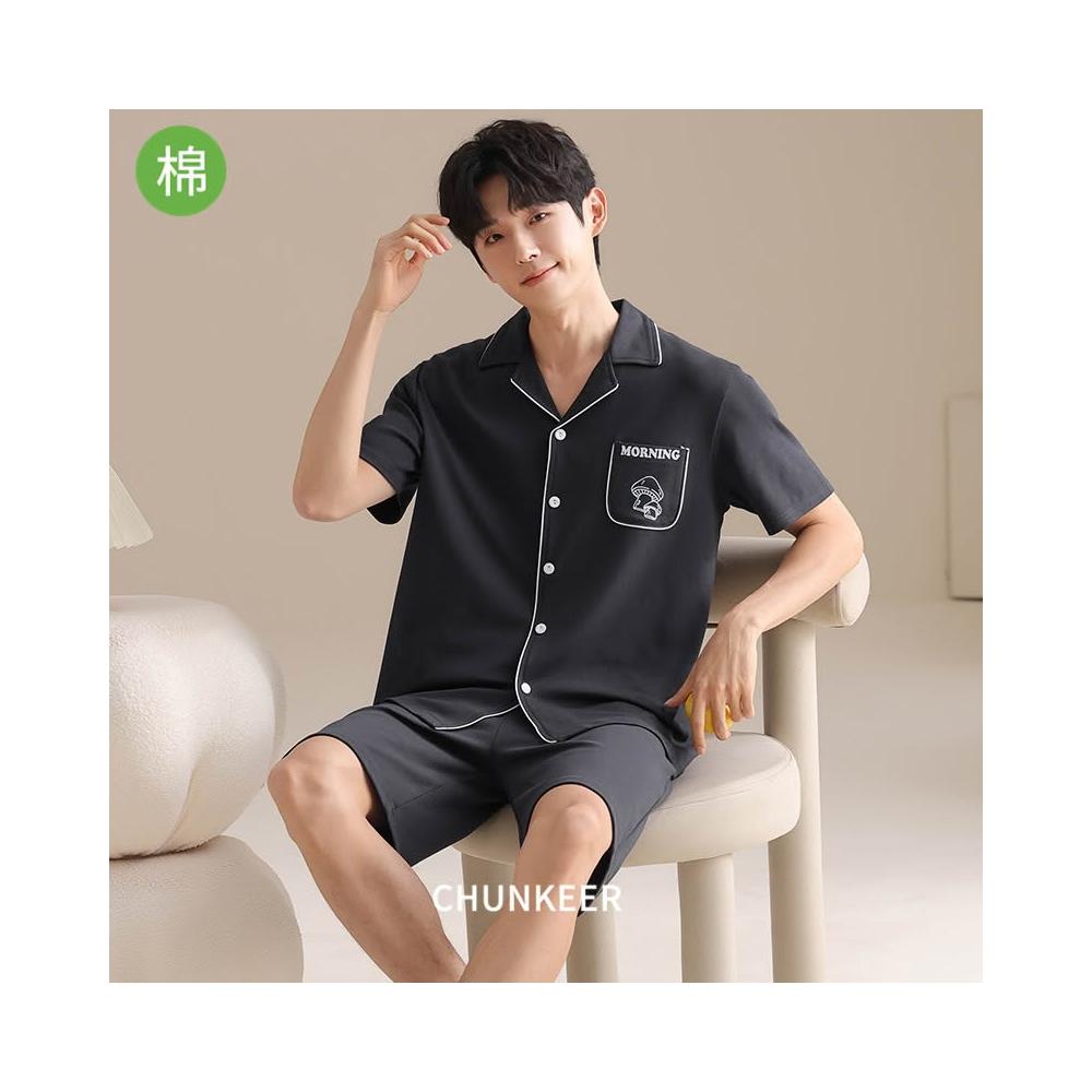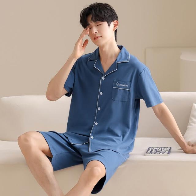 免運 免稅 純棉睡衣男士夏季純色開衫翻領休閑短袖五分褲青年全棉家居服套裝
