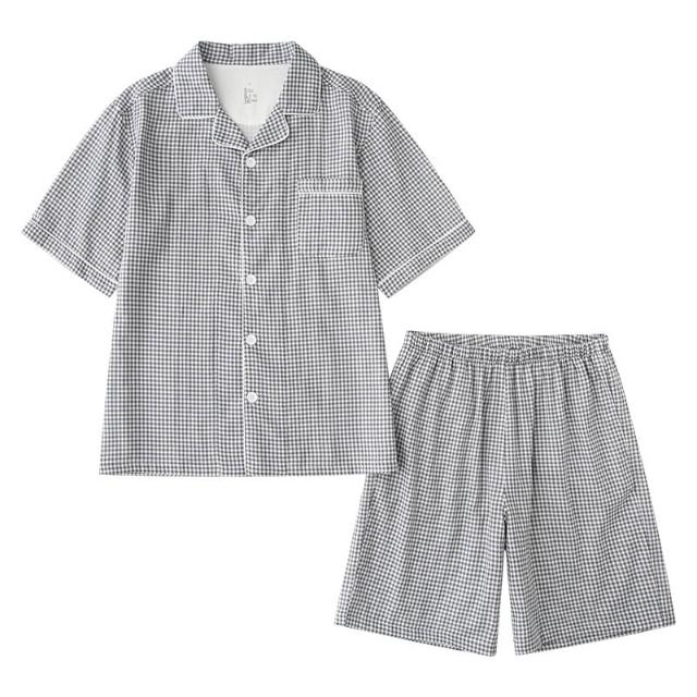 免運 免稅 無側縫夏季無印全棉情侶短袖短褲套裝男女款小格子居家服休閑睡衣