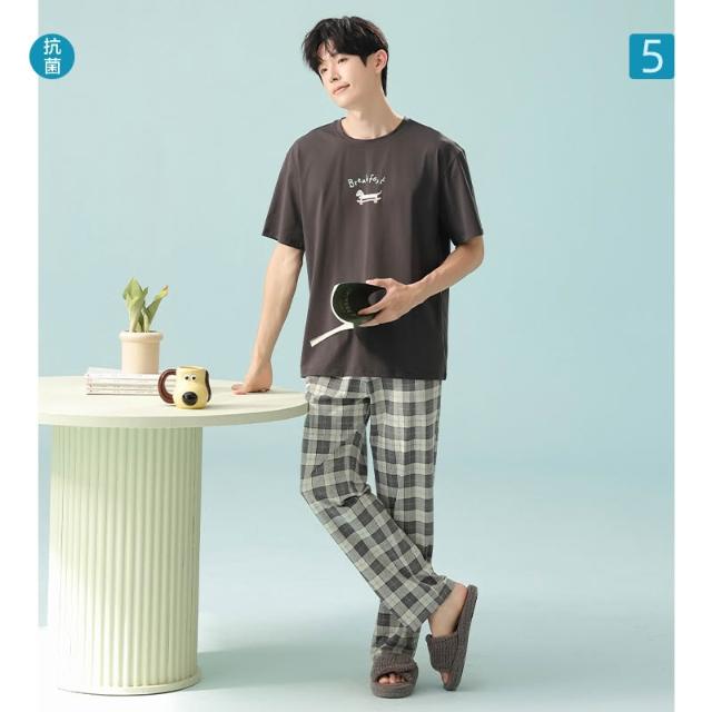 免運 免稅 抗菌新疆棉夏季純棉男士睡衣短袖長褲拉架棉薄款可外穿家居服