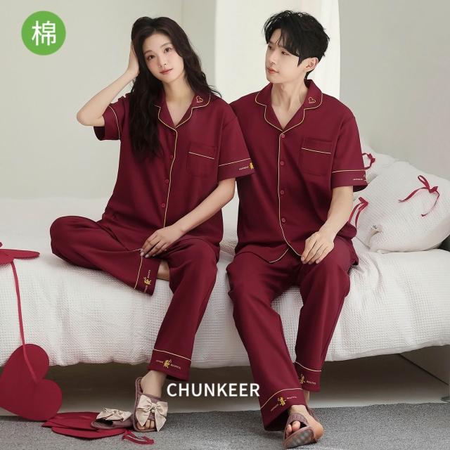 免運 免稅 紅色結婚情侶睡衣一男一女純棉開衫短袖長褲本命年喜慶家居服套裝