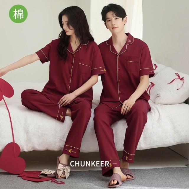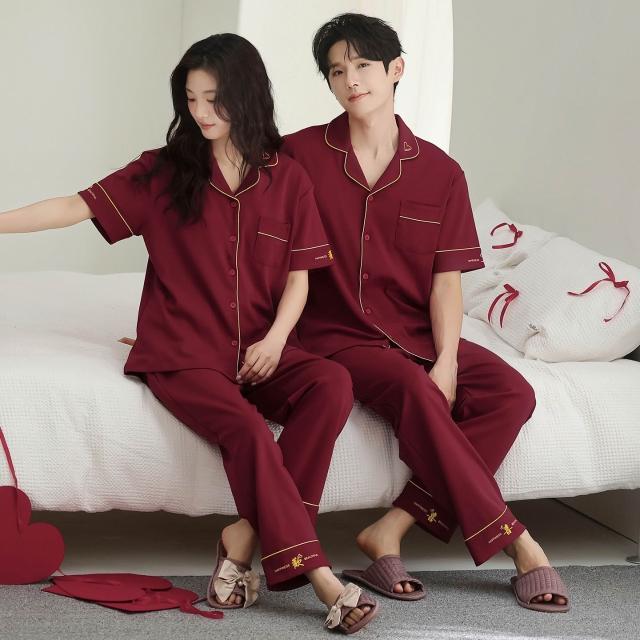 免運 免稅 紅色結婚情侶睡衣一男一女純棉開衫短袖長褲本命年喜慶家居服套裝