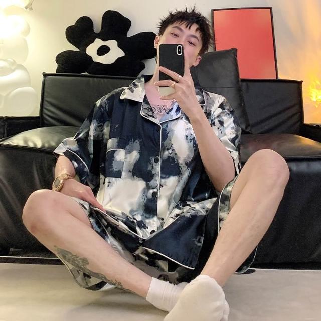 免運 免稅 男士睡衣夏季冰絲短袖短褲男款夏天家居服春秋款男生薄款絲綢套裝