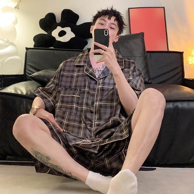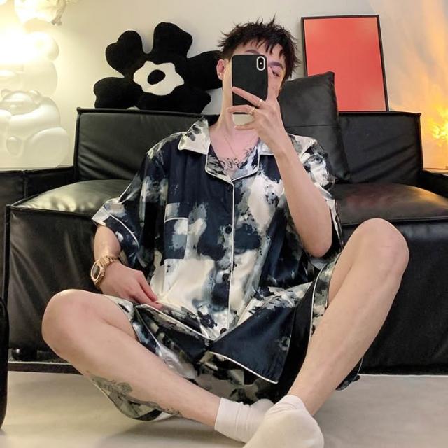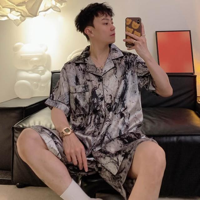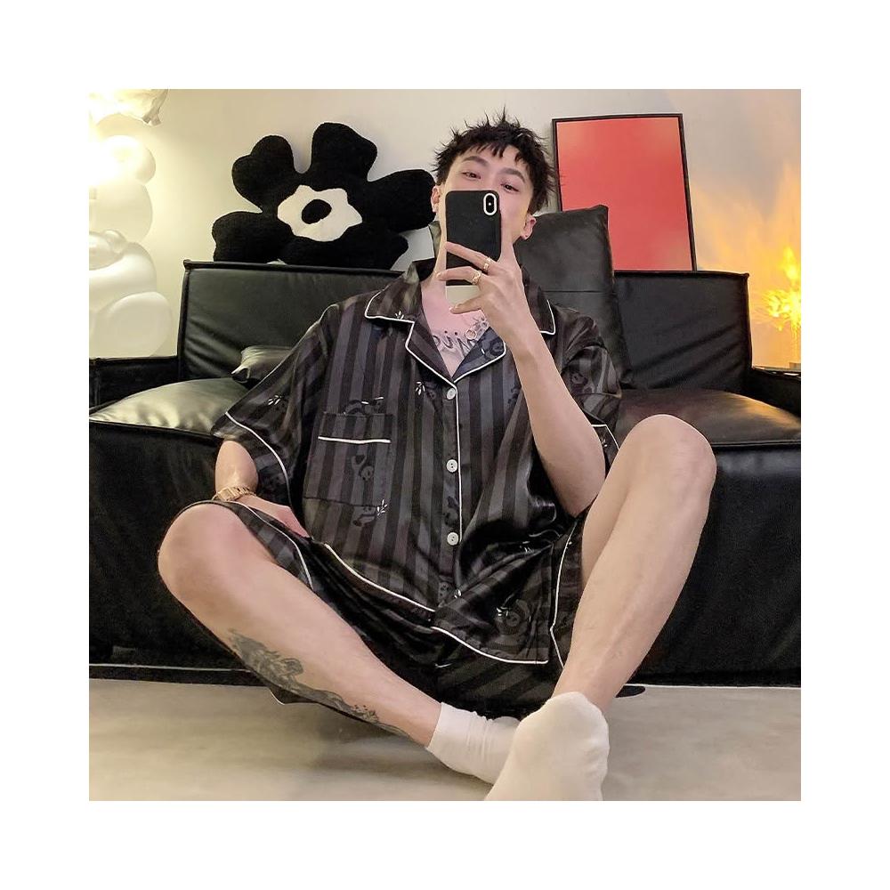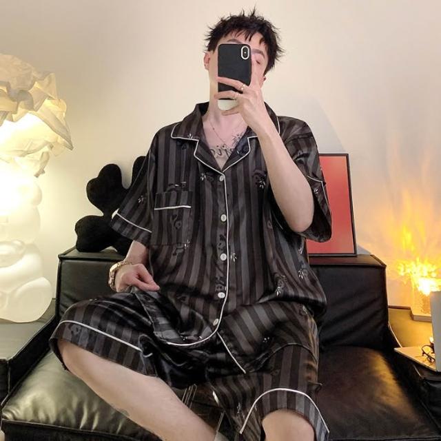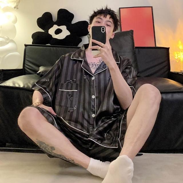 免運 免稅 男士睡衣夏季冰絲短袖短褲男款夏天家居服春秋款男生薄款絲綢套裝