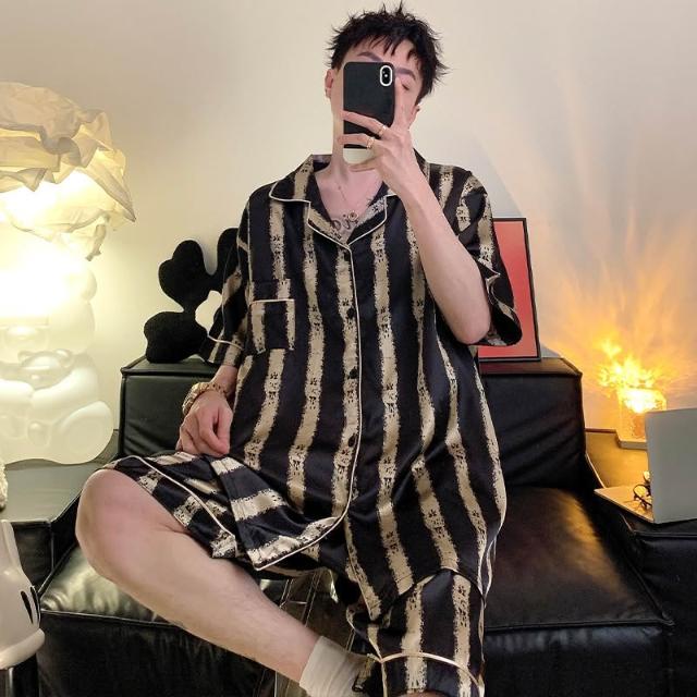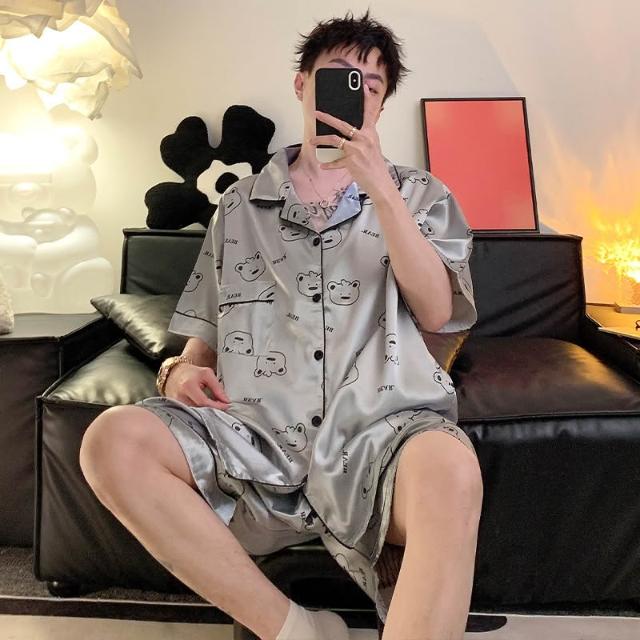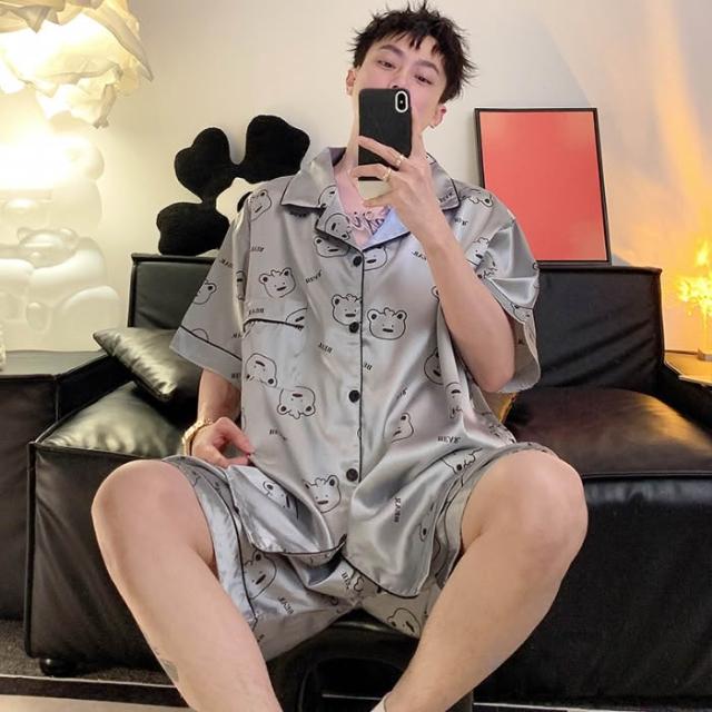 免運 免稅 男士睡衣夏季冰絲短袖短褲男款夏天家居服春秋款男生薄款絲綢套裝
