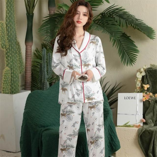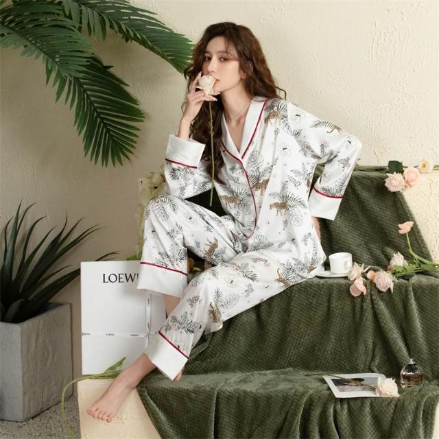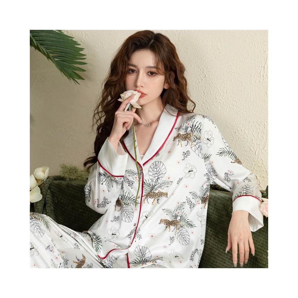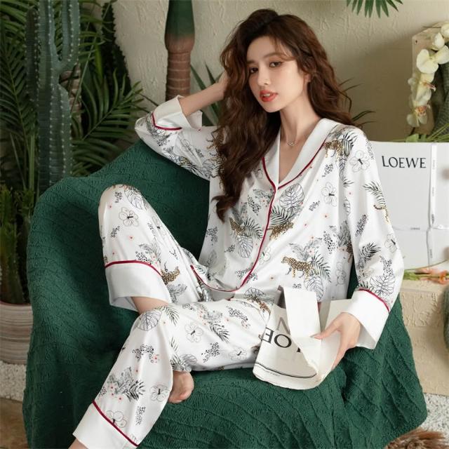 免運 免稅 春秋季睡衣女長袖長褲套裝和服領家居服冰雪絲法式洋氣兩件套女