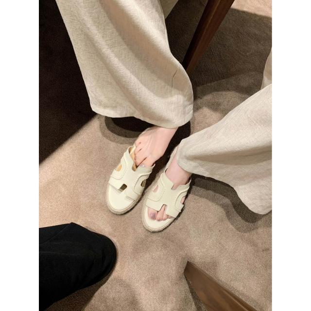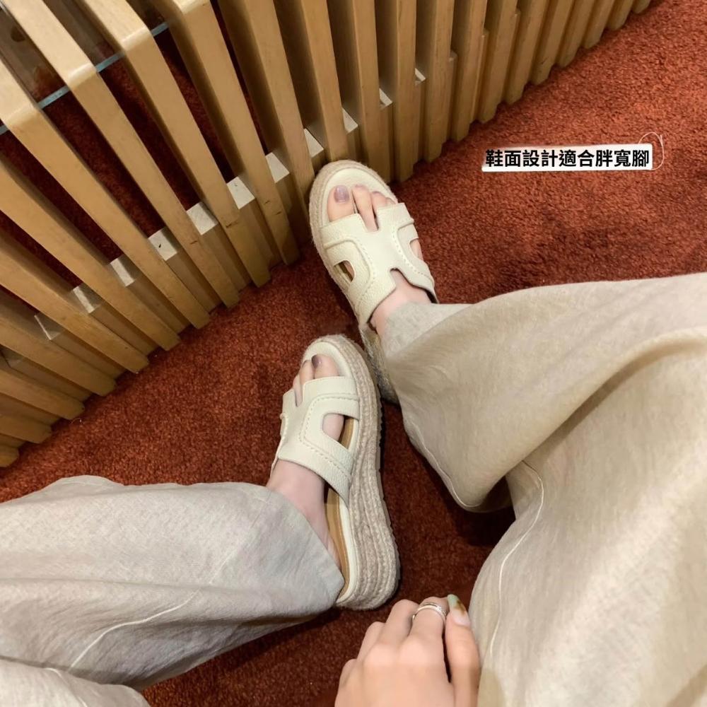 免運 免稅 海灘日記~款夏外穿增高6cm復古真皮草編一字厚底跛跟涼拖鞋女