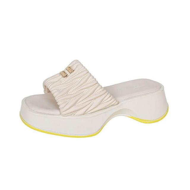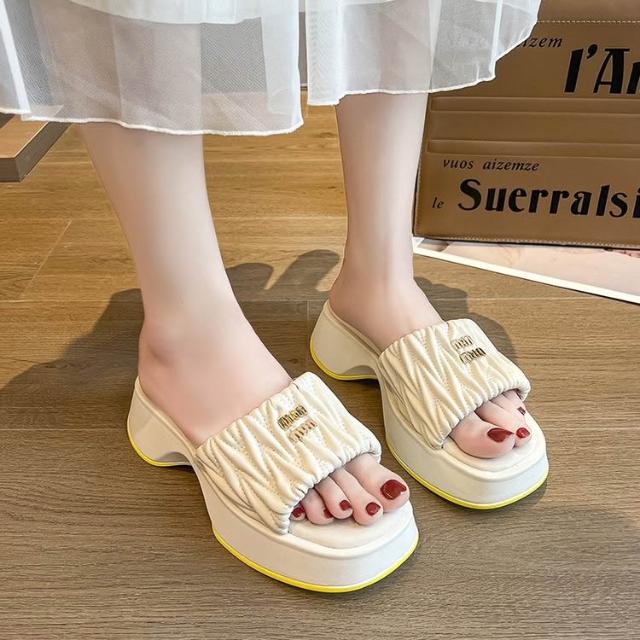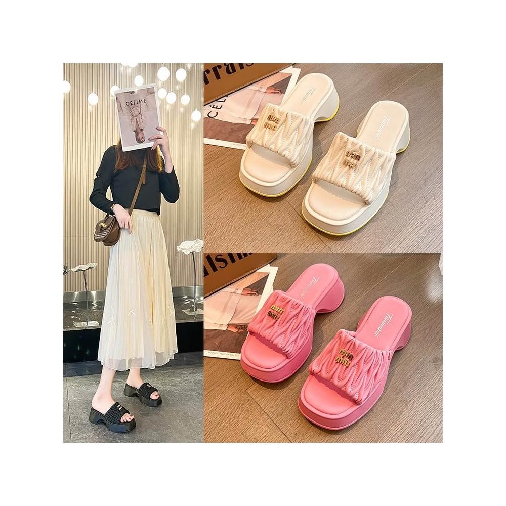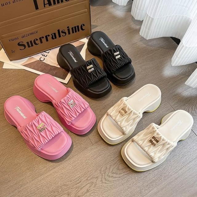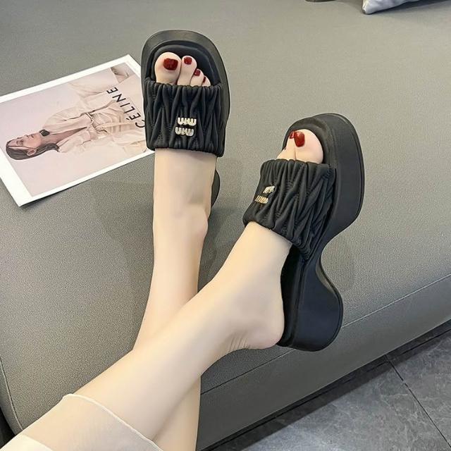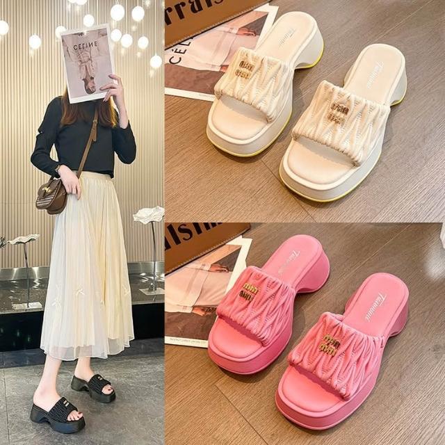 免運 免稅 褶皺雲朵涼拖鞋女休閑時尚方頭坡跟拖鞋夏季外穿一腳蹬懶人拖